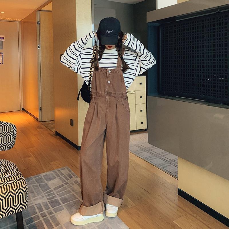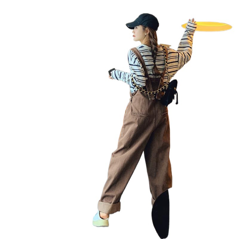 American retro Denim suspender pants for women 2024 Spring and Autumn new women’s loose all-match casual straight wide-leg pants