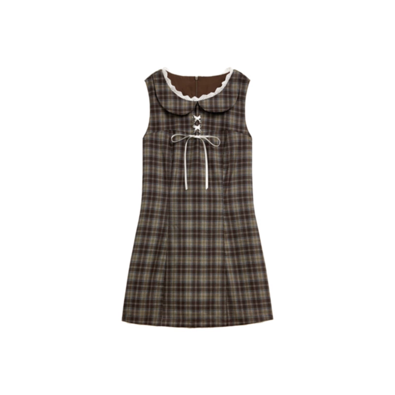 | nameOriginal | American Retro Plaid Doll Collar Lace Splicing Dress Women Summer 2024 New Style Chic Waist Short Skirt |