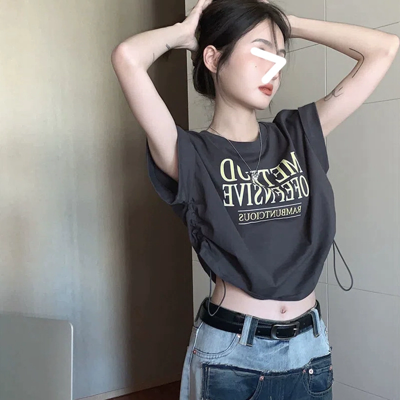 | nameOriginal | American retro right-shoulder short-sleeved T-shirt for women in summer, waist-cinching short style, navel-baring hem drawstring, slimming sweet hot girl top |