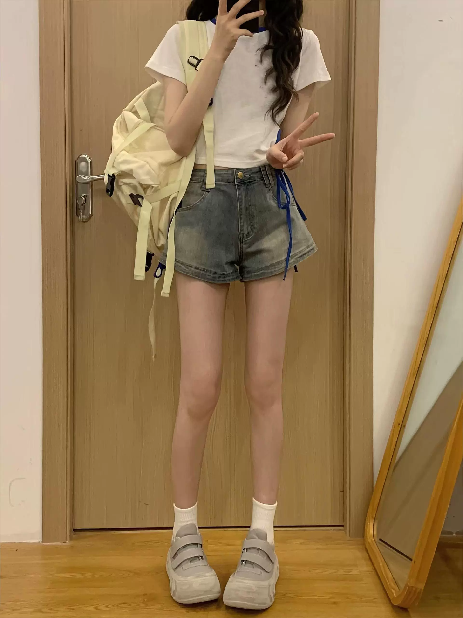 | nameOriginal | American retro washed distressed denim shorts for women summer design high-waisted straight slimming A-line wide-leg hot pants |