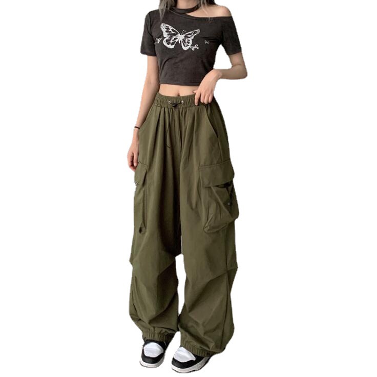 American retro workwear casual pants women’s summer versatile straight draping ankle-tied trousers loose wide-leg pants ins