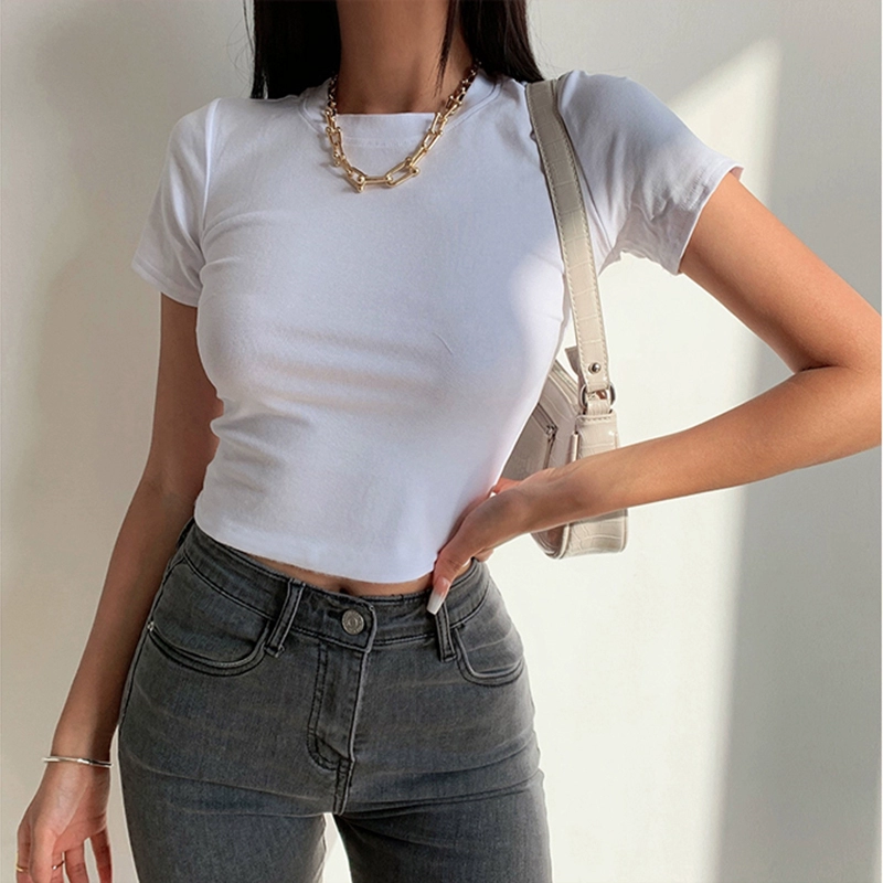 American small round collar navel shirt solid color short -sleeved T -shirt