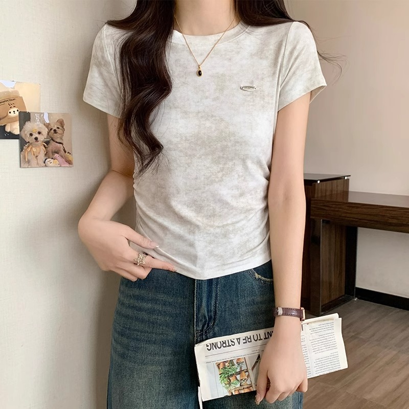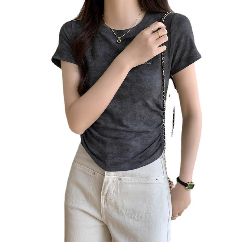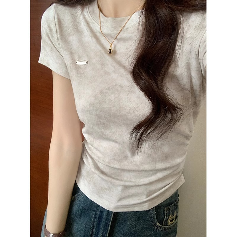 | nameOriginal | American Round Neck Shoulder Short-sleeved T-shirt Women's Spring and Summer New Design Sense Pleated Waist Pure Slim-fit Small Shirt Top |