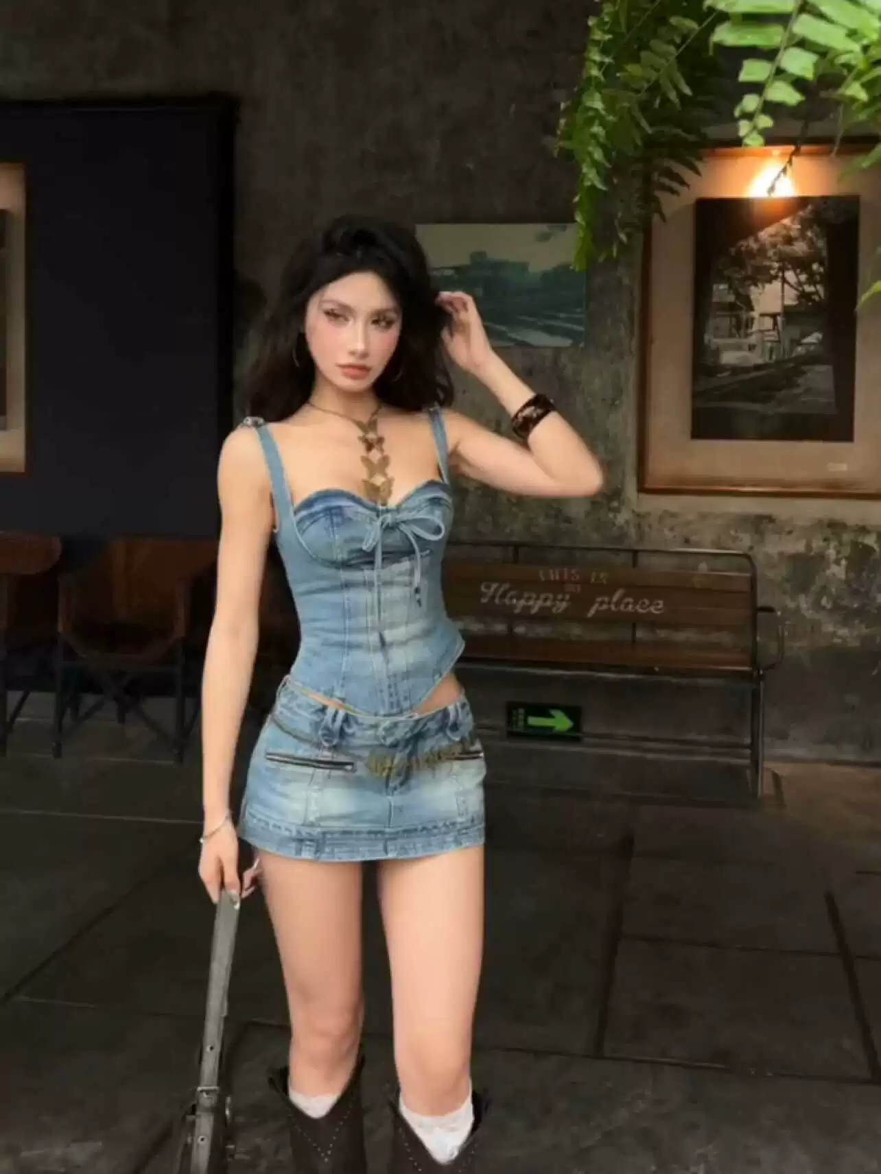 American sexy back hanging neck irregular denim skirt