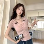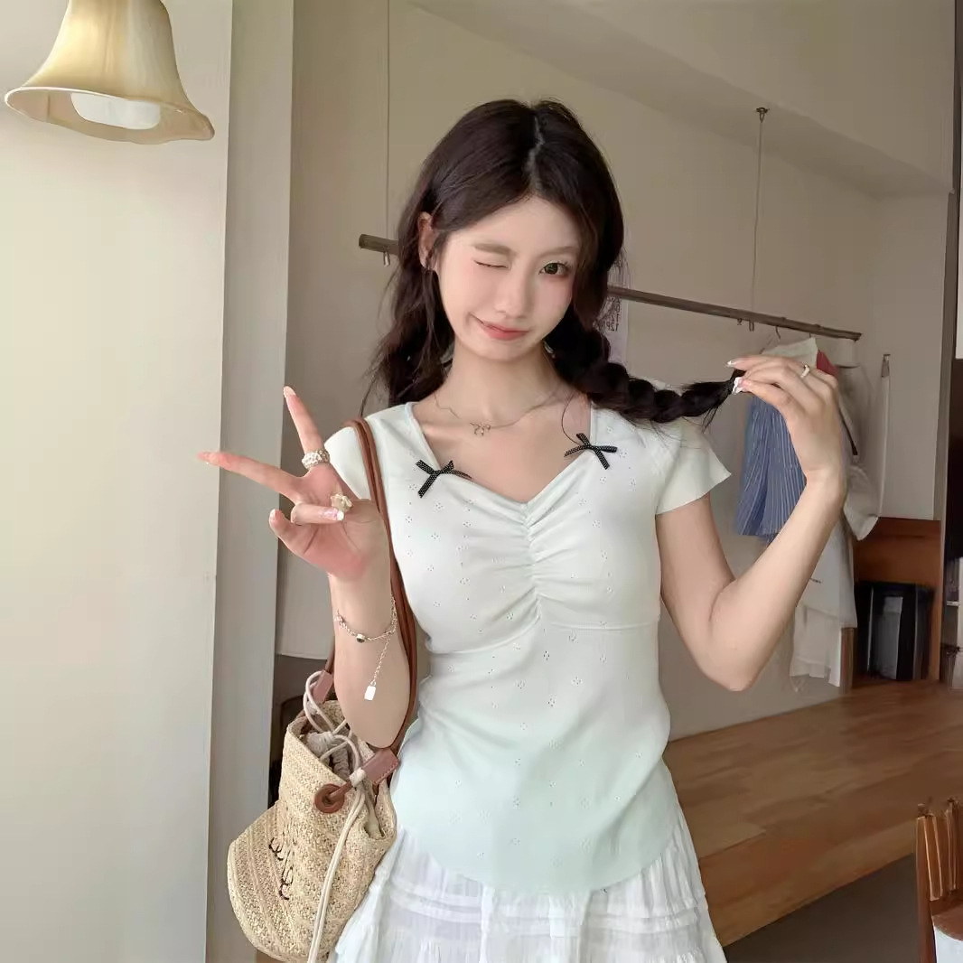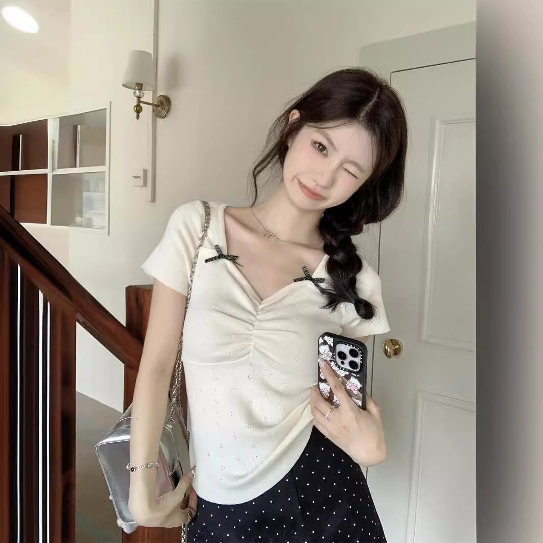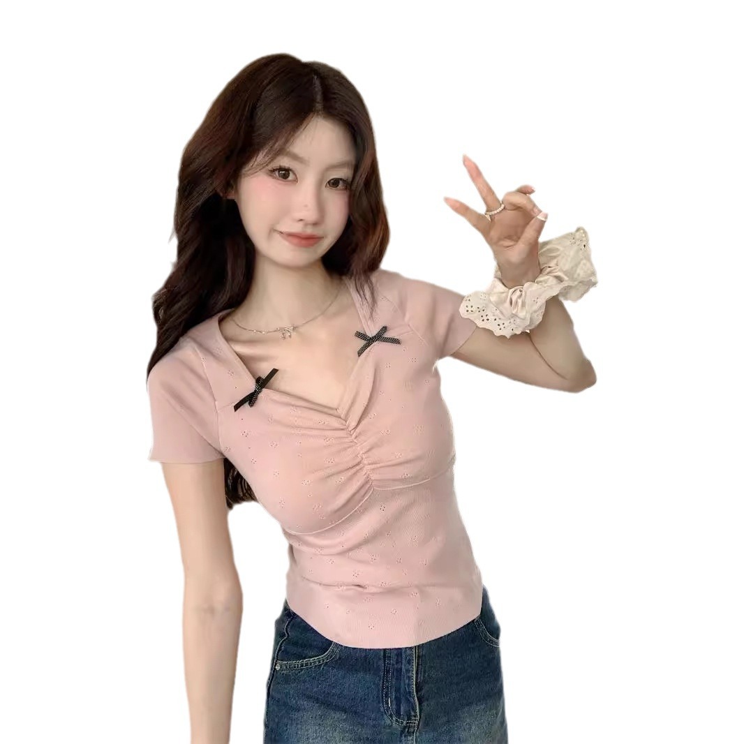 | nameOriginal | American Style 2024 Summer Korean Style Slim-Fit Sweet Pleated Bow Hollow Design Knitted Shirt Short-Sleeved Women's Top |