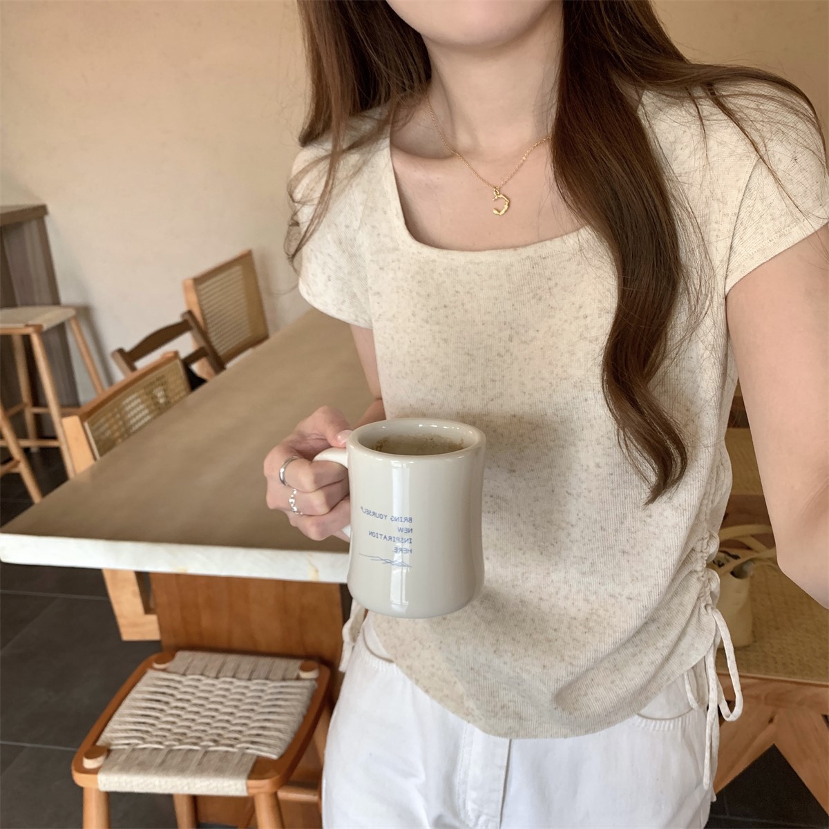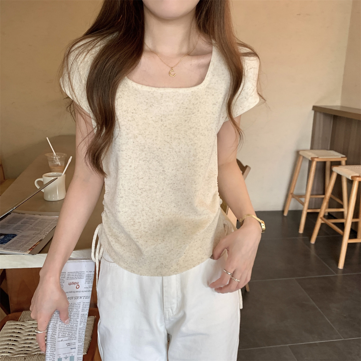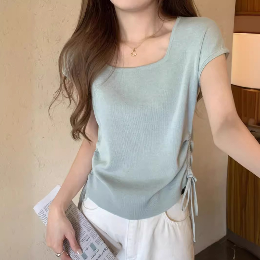 | nameOriginal | American Style 2024 Summer Korean Style Square Neck Elegant Drawstring Slimming Linen Thin Knitted Shirt Short Sleeve Women's Fashionable Top |