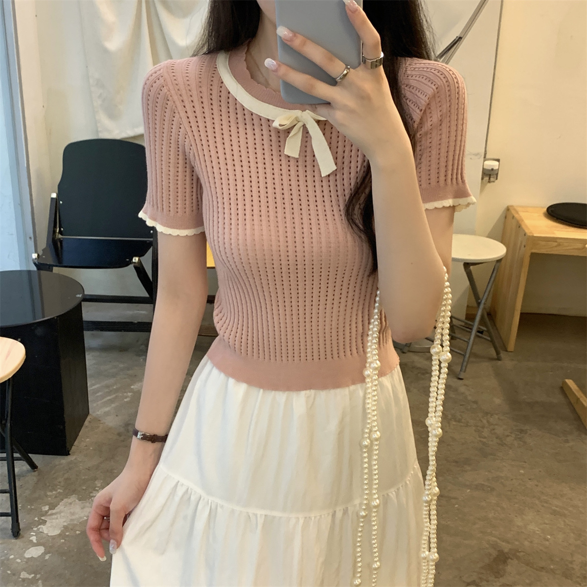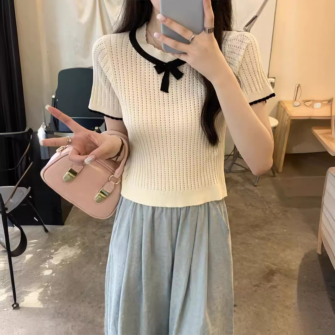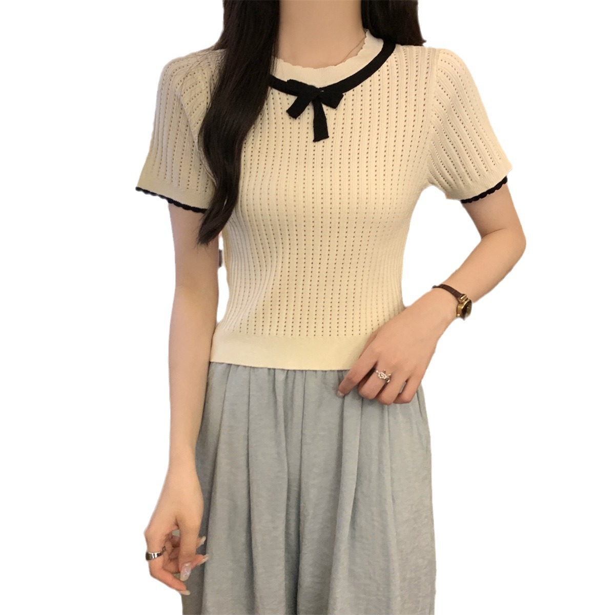 | nameOriginal | American Style 2024 Summer New Korean Style Slim-fit Contrast Color Round Neck Bow Hollow Design Sense Knitted Short-sleeved Top |
