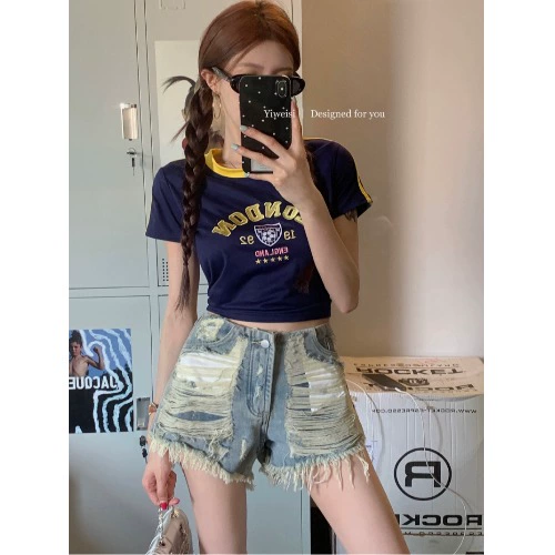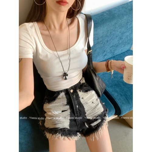 American style irregular ripped raw edge high waist jeans