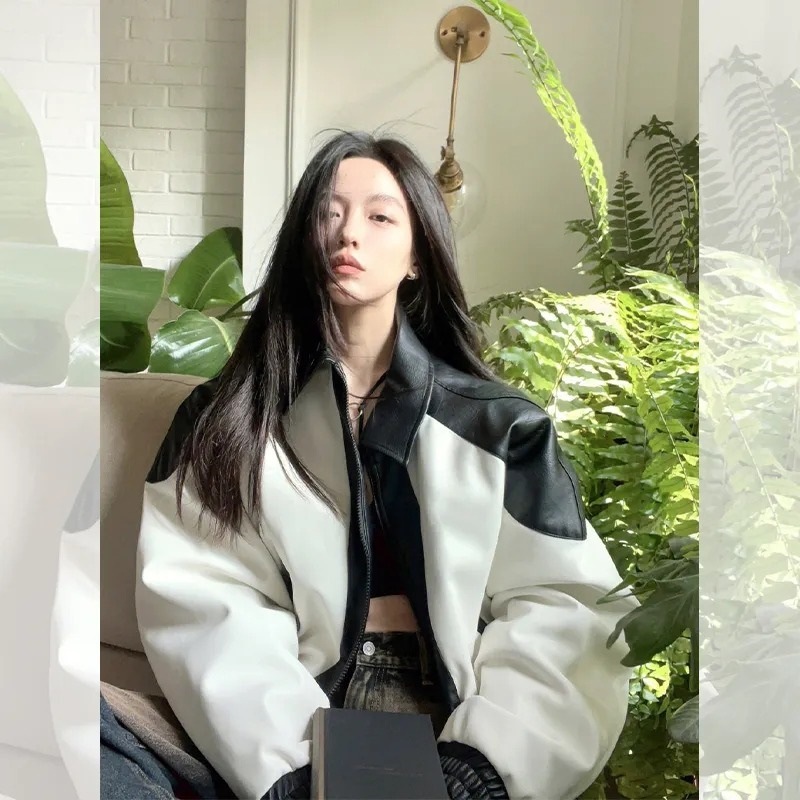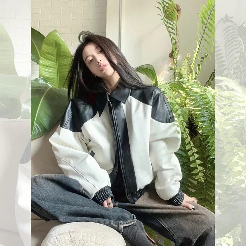 | nameOriginal | American-style retro black and white leather motorcycle coat for women this year's popular baseball uniform jacket fashionable top |