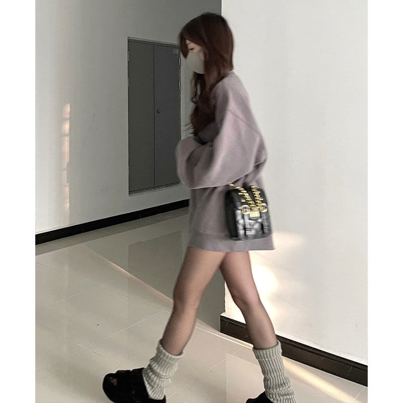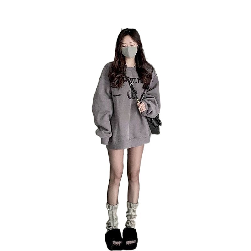 American Style Retro Cement Grey Sweater Women's Winter fleece-lined Thickened Loose Couple's Round Neck Top Men's Jacket