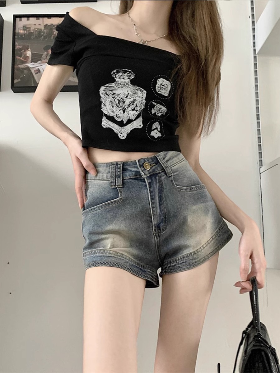 American Style Retro Denim Shorts Women's Summer Hot Girl chubby girl Pants High Waist Slim Look Old A- line Ultra Short Hot Pants Trendy