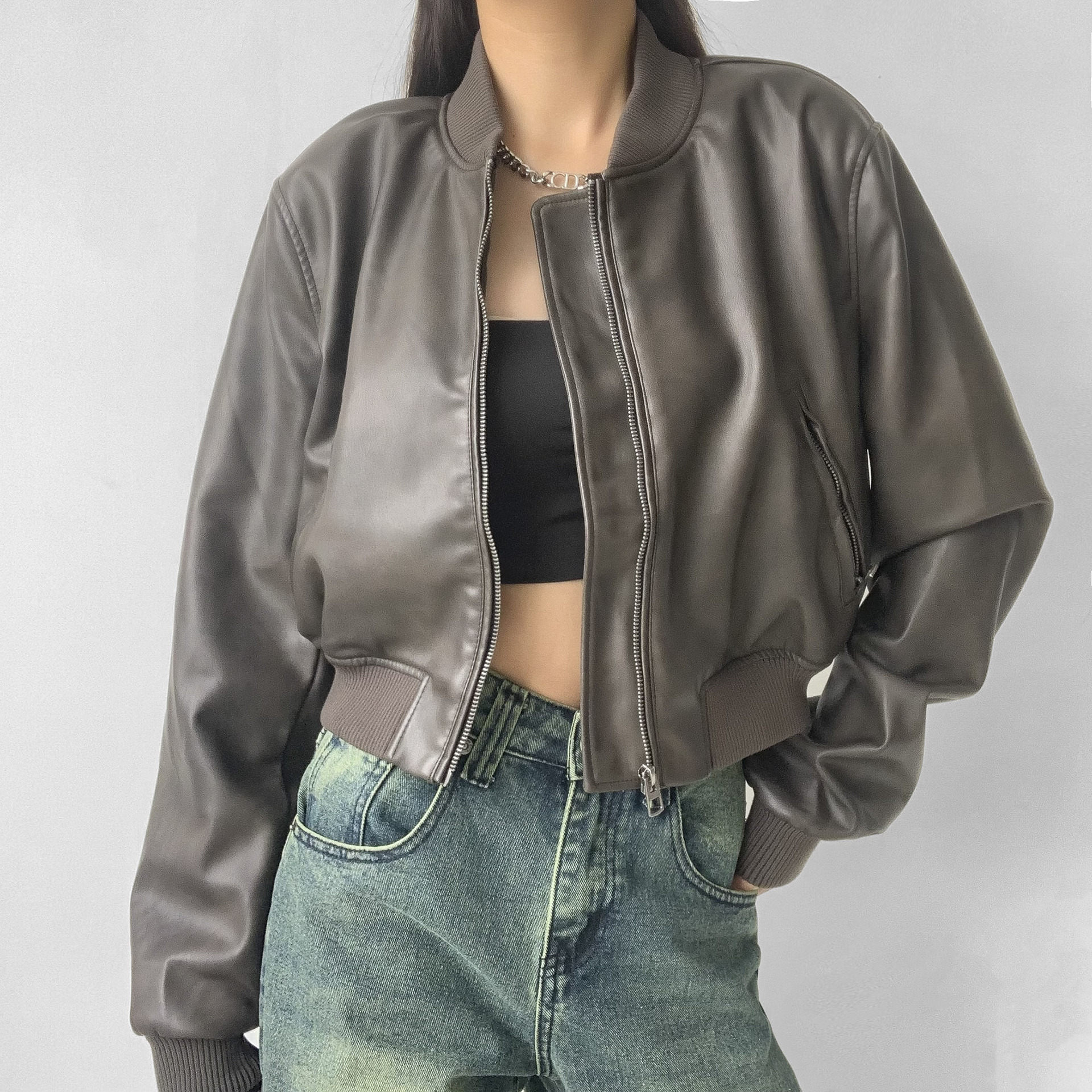 American-style retro faux leather pilot jacket women’s autumn short leather jacket long-sleeved motorcycle jacket