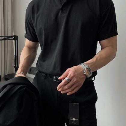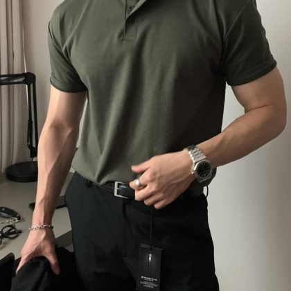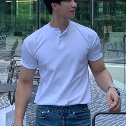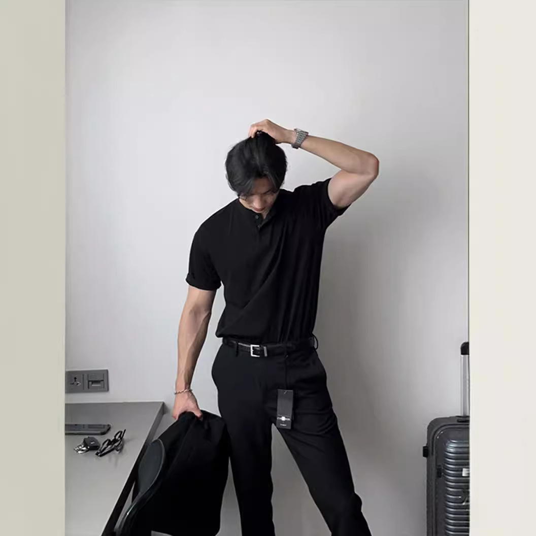 American Style Retro Heavy-weight Short-sleeved T-shirt Men’s Polo Shirt Mature and Steady Tight Cuff Fitness Tough Guy Henry Shirt
