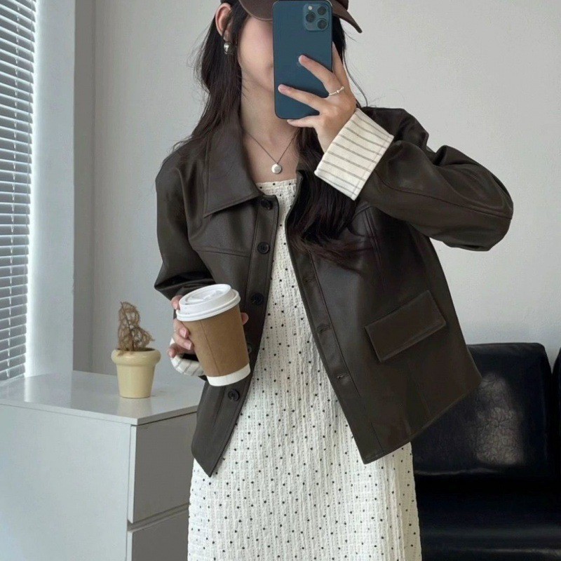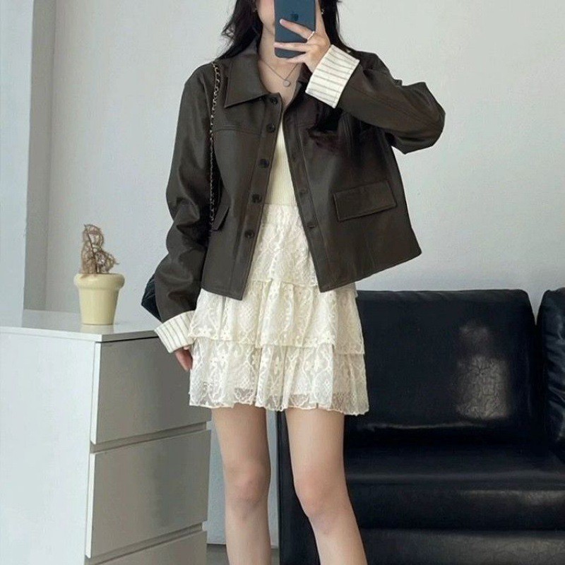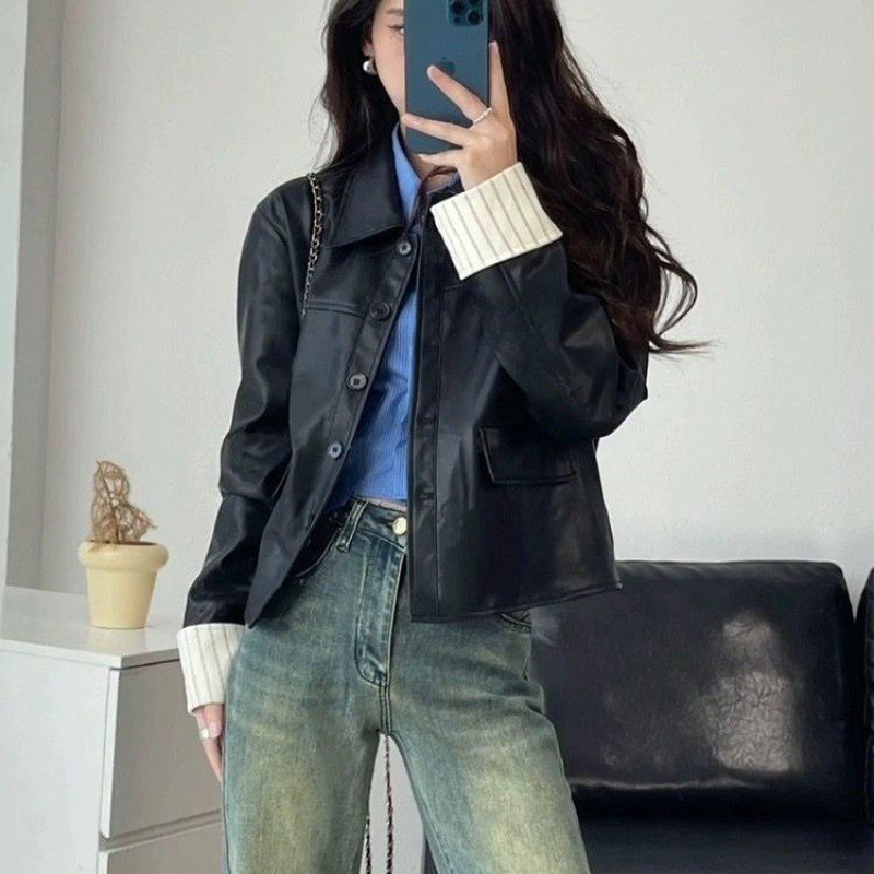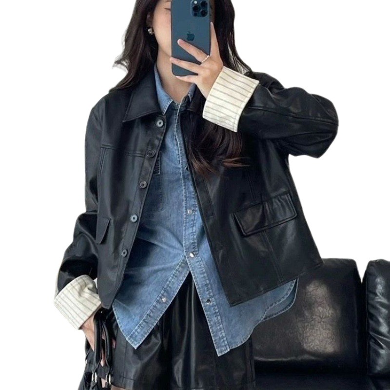 | nameOriginal | American Style Retro Leather Clothing Women's Early Autumn Loose All-match High-end Niche Design Cuff Contrast Color Short Jacket Coat |
