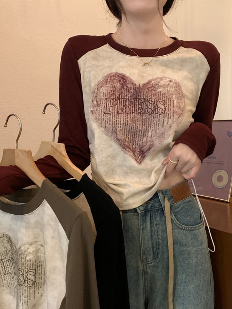 | nameOriginal | American Style Retro Printed T-shirt Women's Inner Design Side Pleated Base Shirt Shoulder Raglan Sleeve Cotton Top |