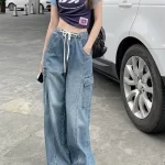 American style spring pocket high waist floor-length trousers with drawstring