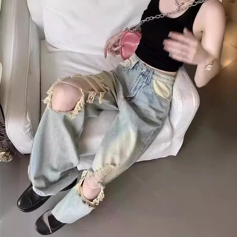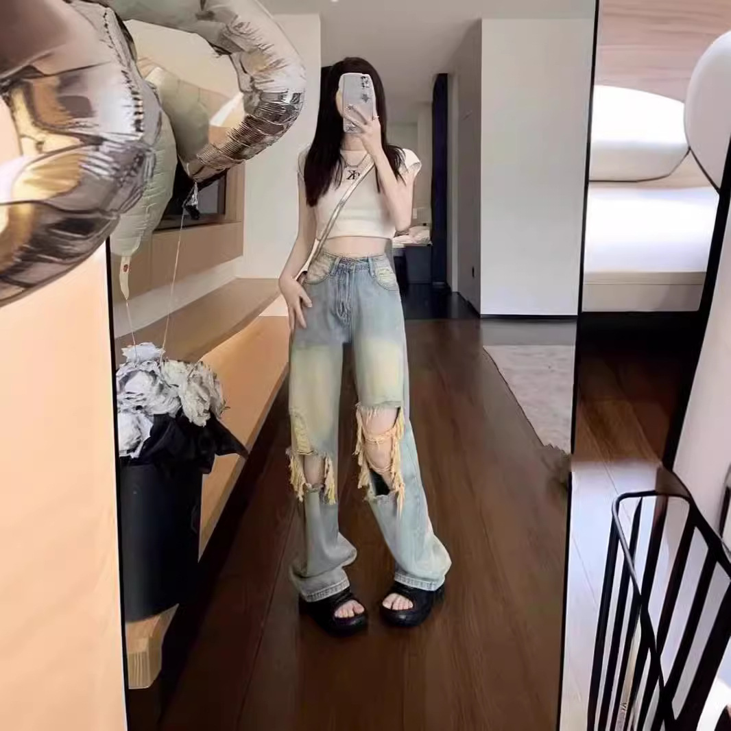 American Washed Pants High Street Retro Ripped Jeans Men’s and Women’s Summer Straight Loose High-end Sense Beggar Pants Trendy
