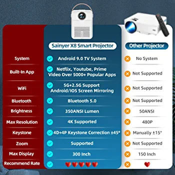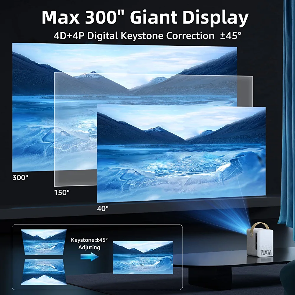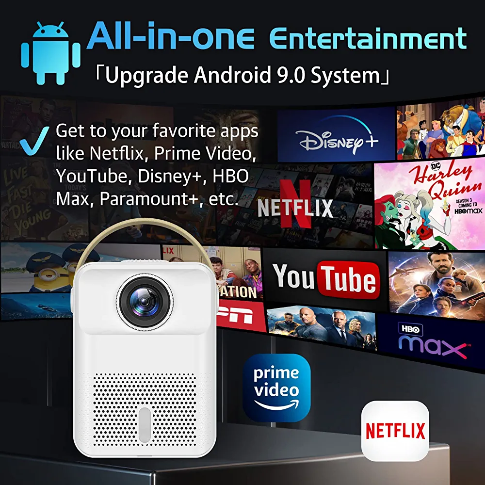 | nameOriginal | Smart Projector with Android System, Projector with WiFi and Bluetooth for Outdoor Movies, Max 300” 4K Display Supported, Compatible with Smartphone, TV Stick, Laptop, PS4/XBOX, HDMI, USB, Zoom, ±45° |