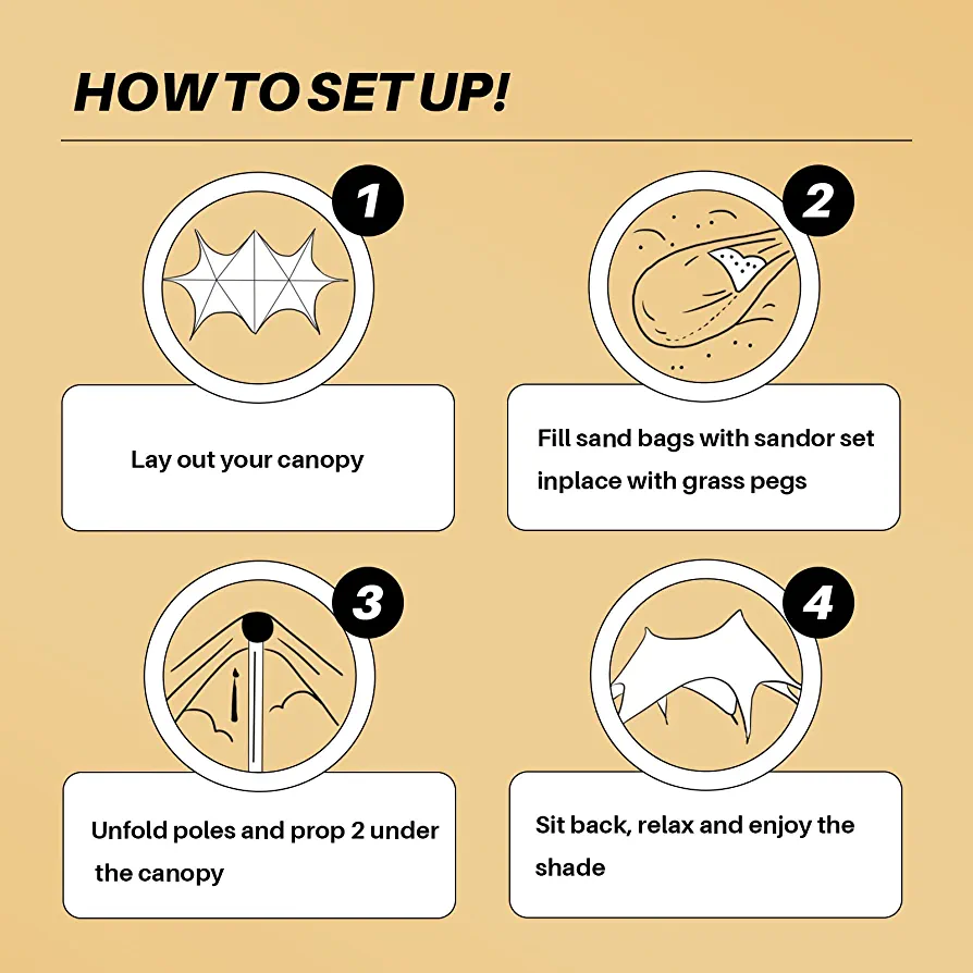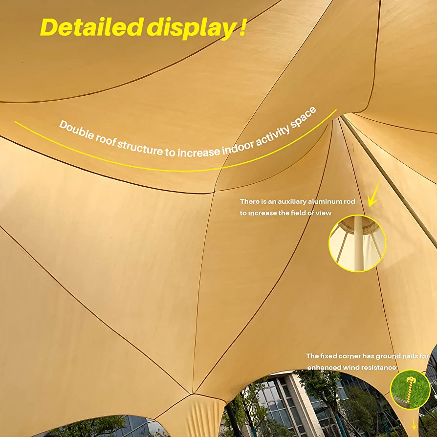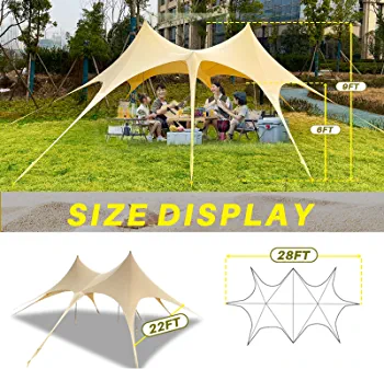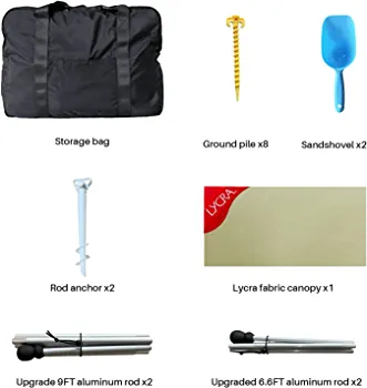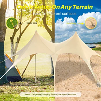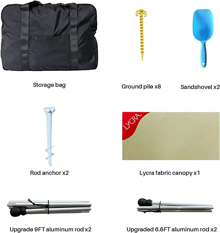 AN ANEWSIR Beach Tent Canopy, New Desgin, 9ft Tall, 13 x 20 ft diameter, 2x 9ft aluminum poles and 1x 6.5ft alumium pole for selective use,8 large sandbags, 8x anchors, only 12 pounds with carrying bag. Made of Lycra water-resistant fabric with UPF 50+ protection, it can block 98% of harsh sunlight and reduce sunburn or glare.