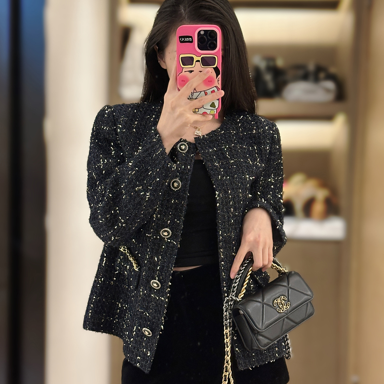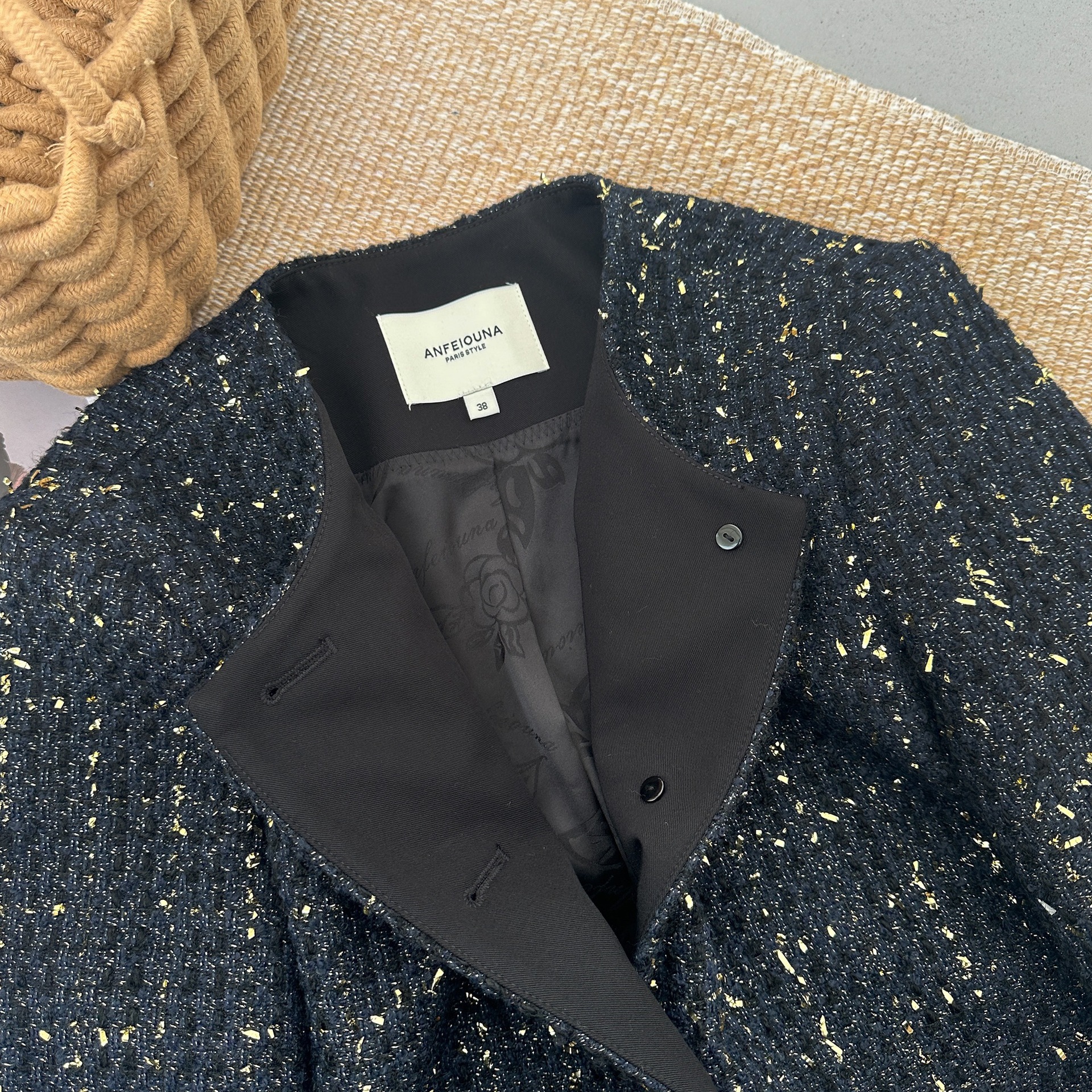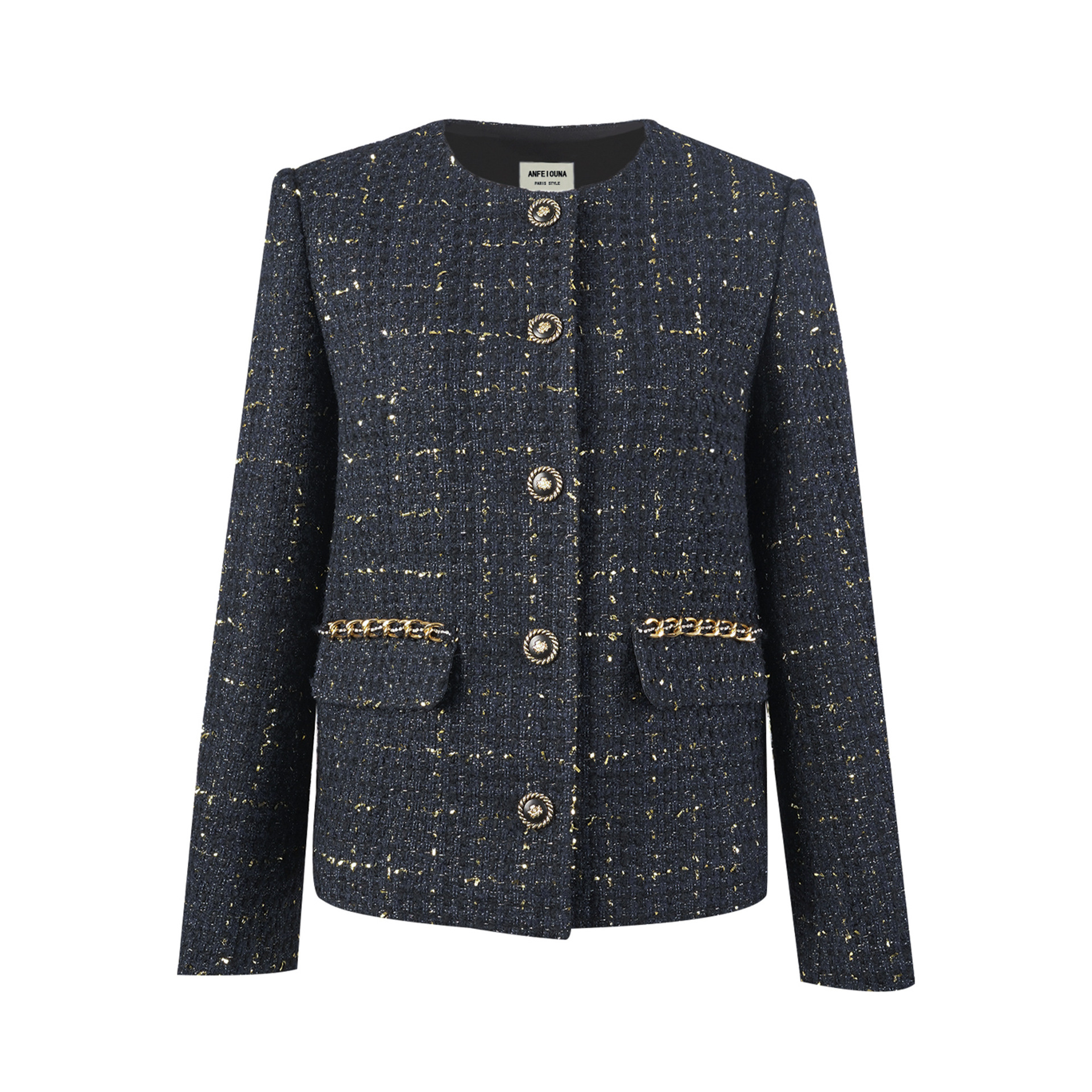 Anfeiona 2024 New French plaid wool polyester tweed light luxury black gold lace Chanel style women’s coat