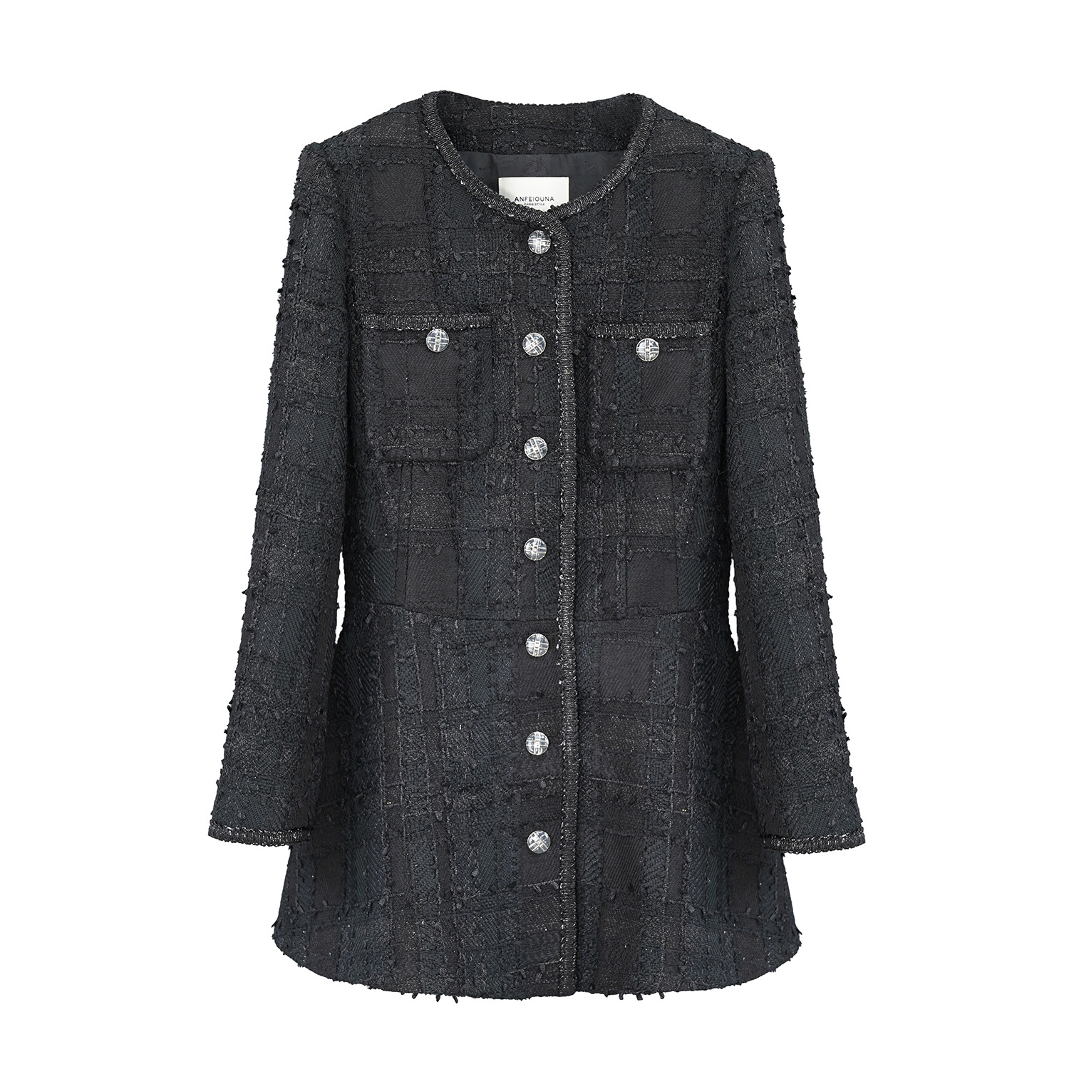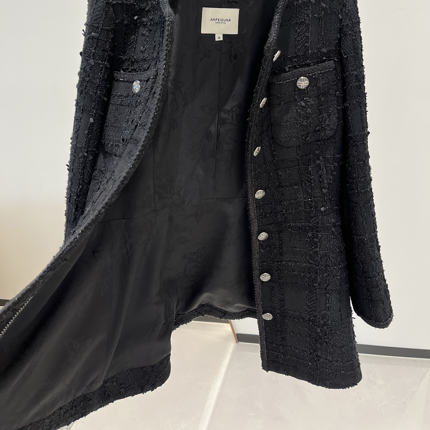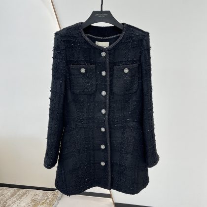 | nameOriginal | Anfeiona Spring and Autumn New French style Chanel black bright silk tweed mid-length slim-fit slimming coat |