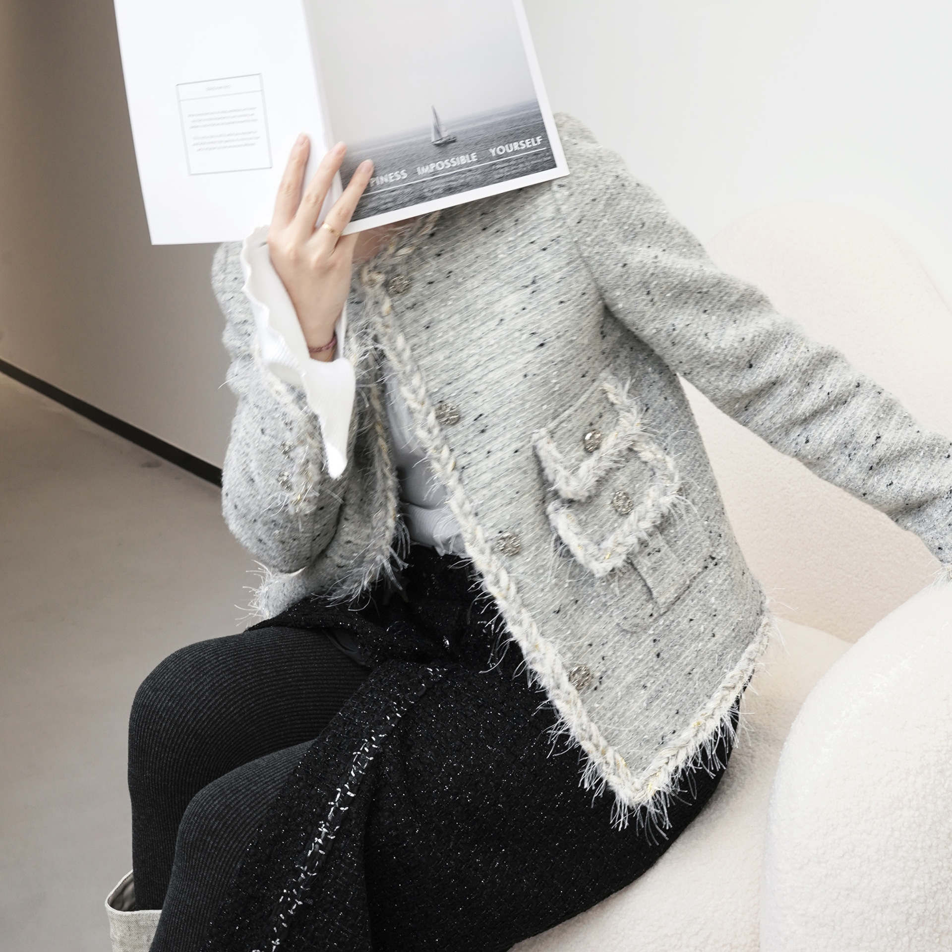 Anfiona 2024 New French Style Wool Tweed High Grey Heavy Industry Tassel Lace Women’s Coat