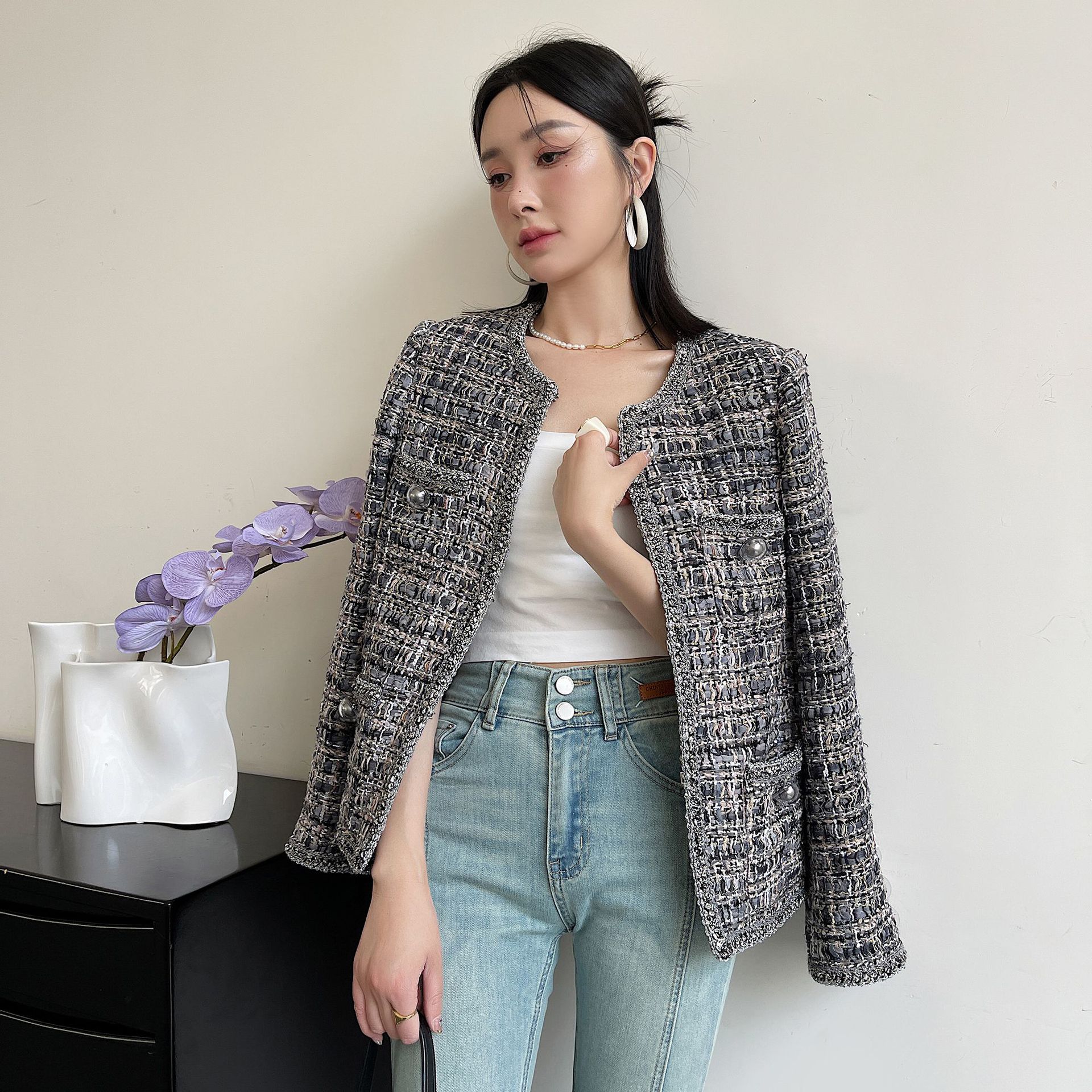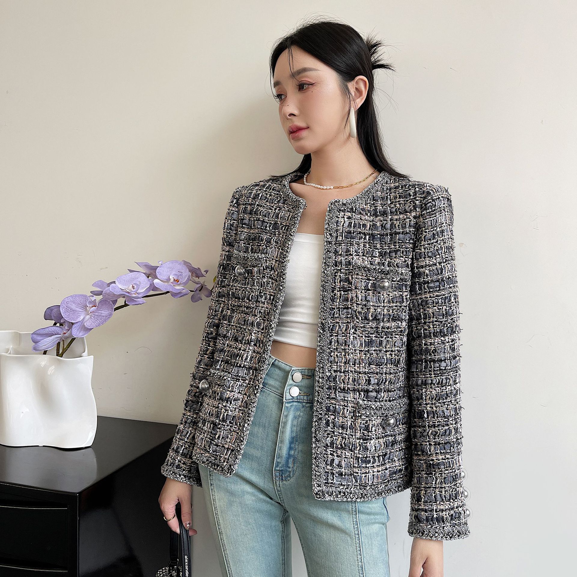 | nameOriginal | Anfiona Spring and Autumn New French Style Cotton and Polyester Blended Tweed Round Neck Lace Women's Coat with Hidden Buckle |