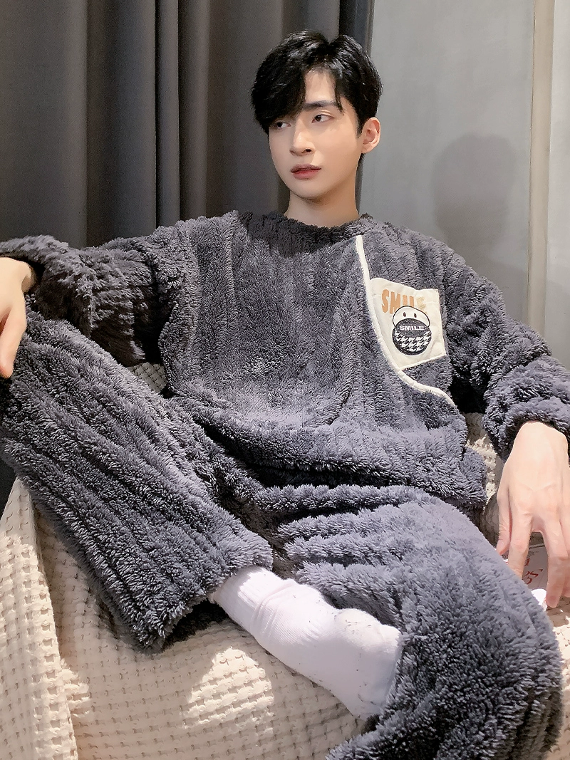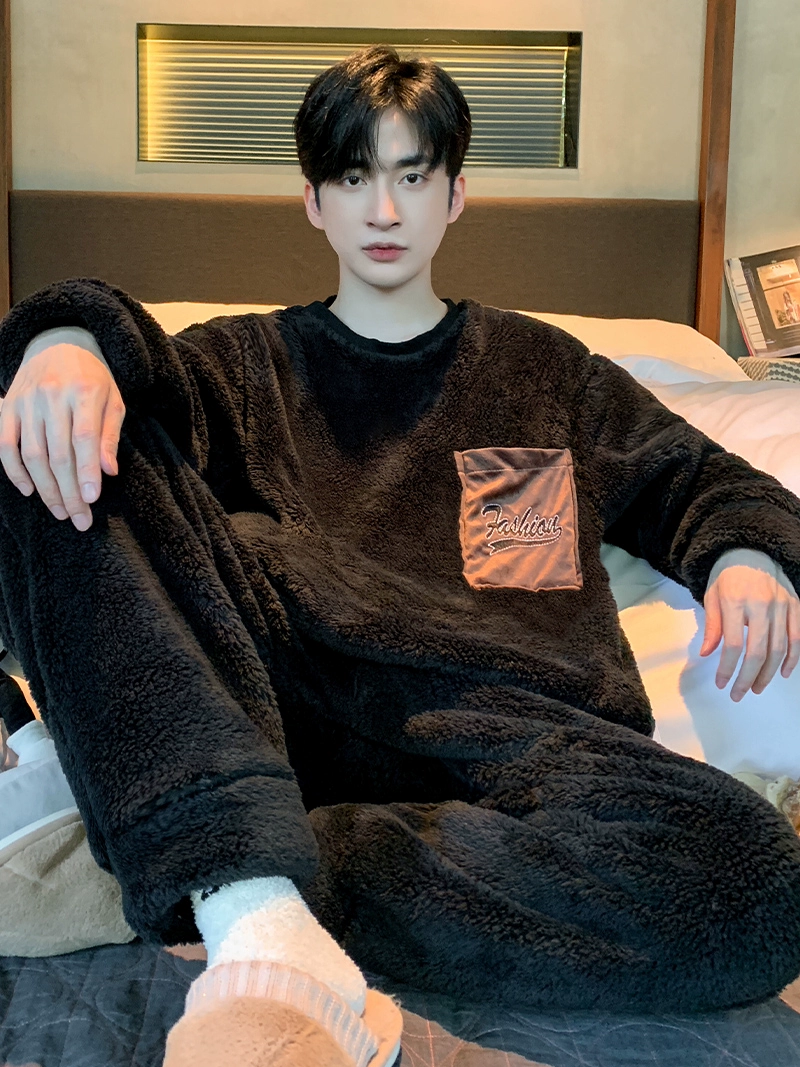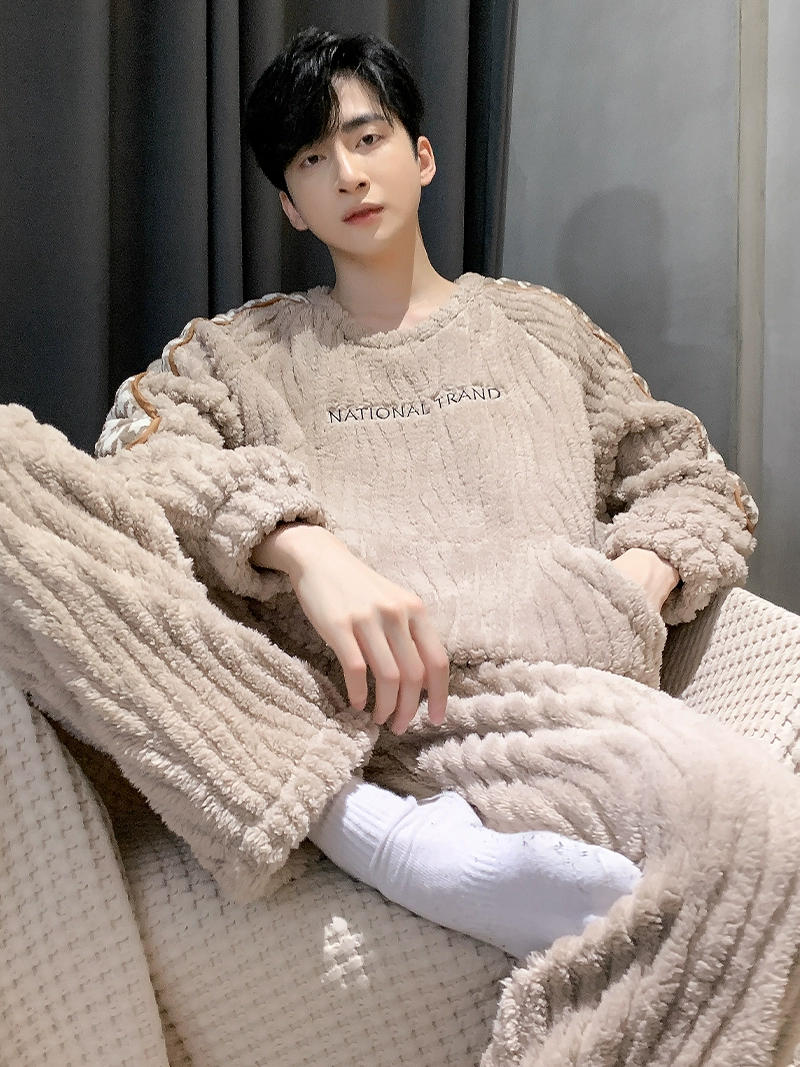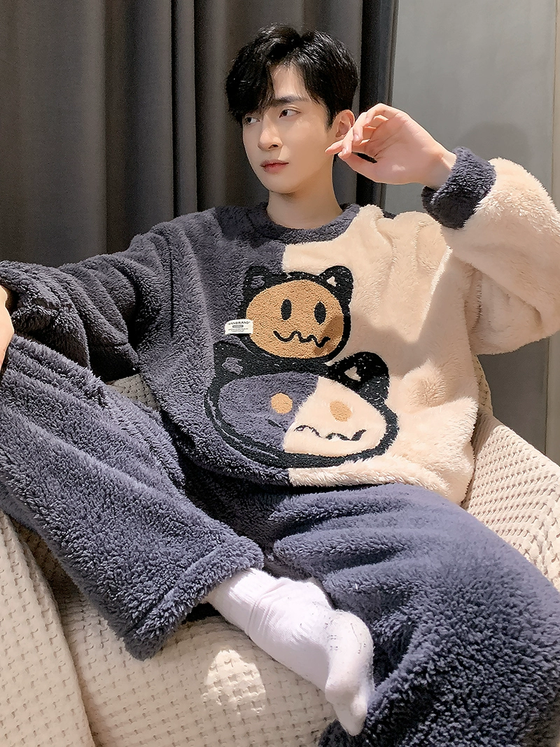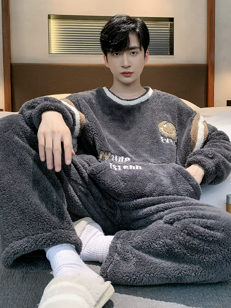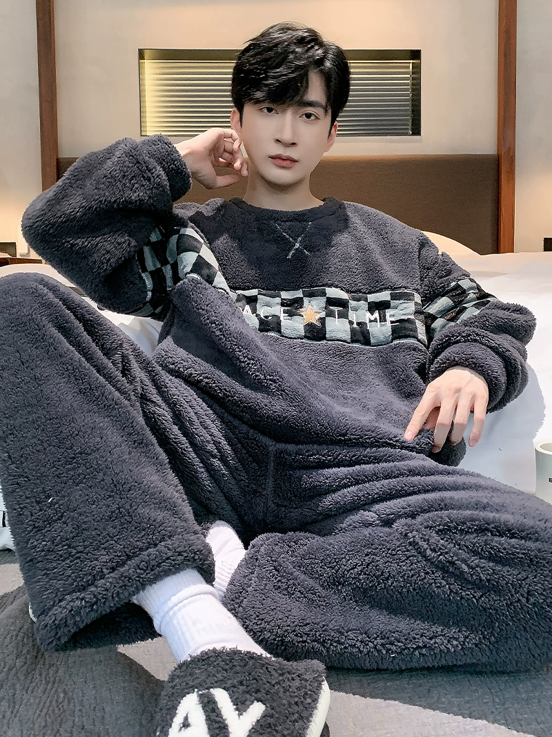 Antarctic Coral Velvet Pajamas Men’s Winter Autumn and Winter Plus Velvet Thickened Warmth Large Size Flannel Home Clothes Set