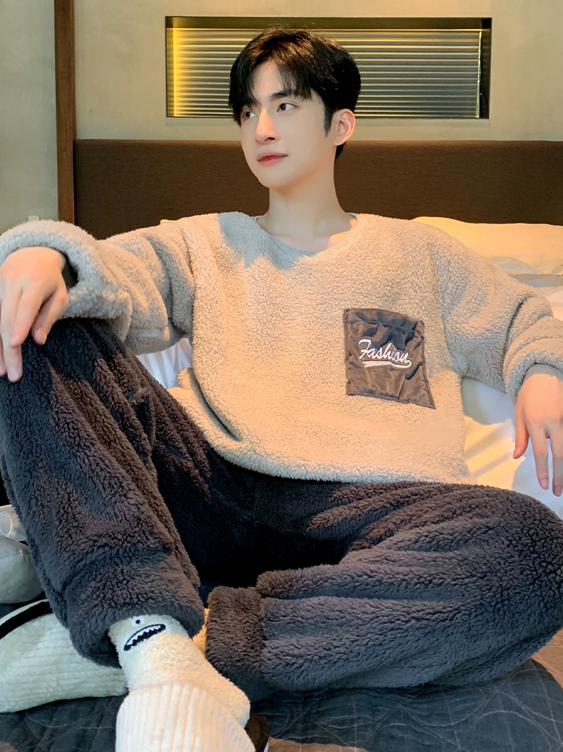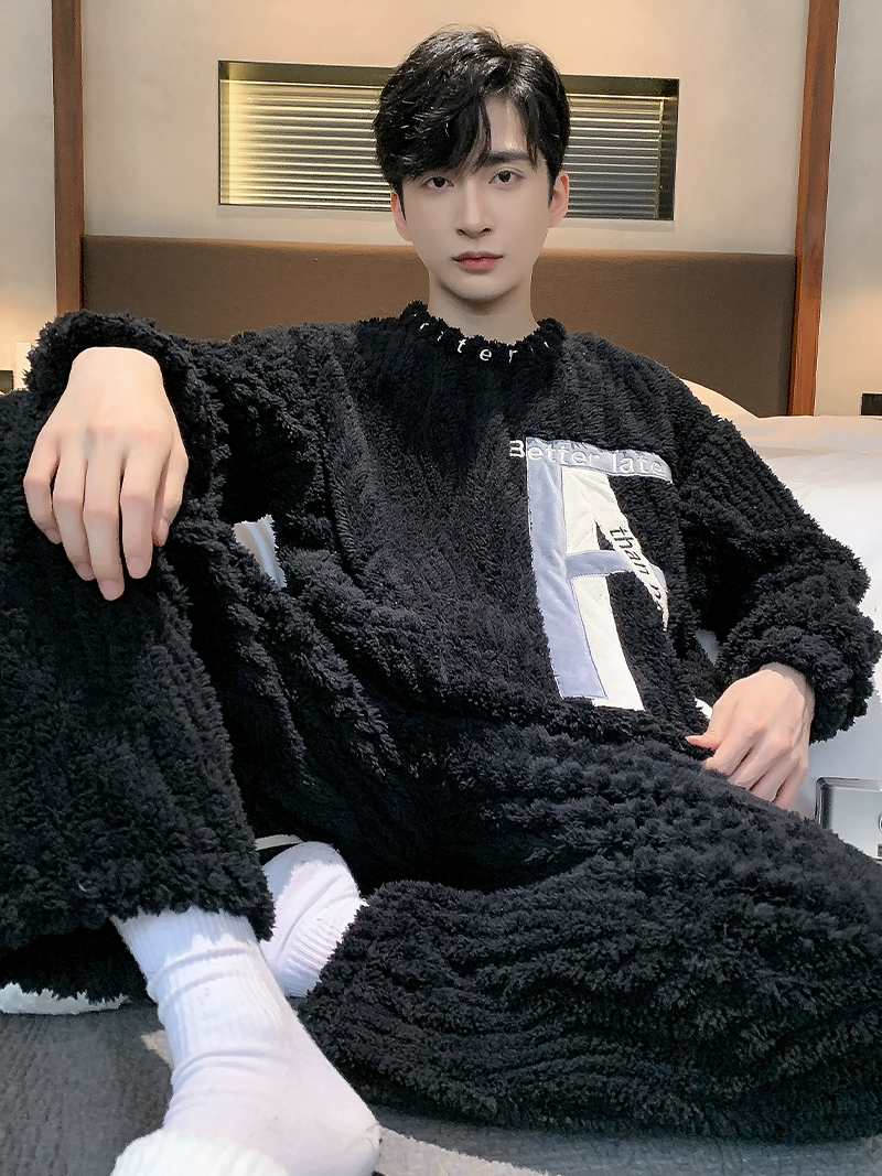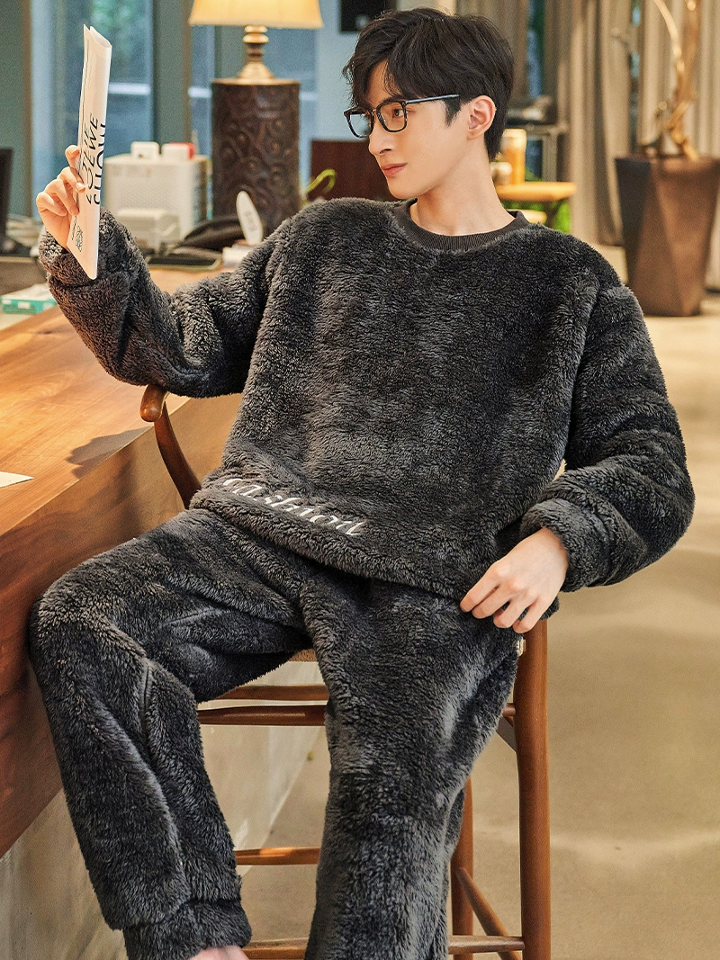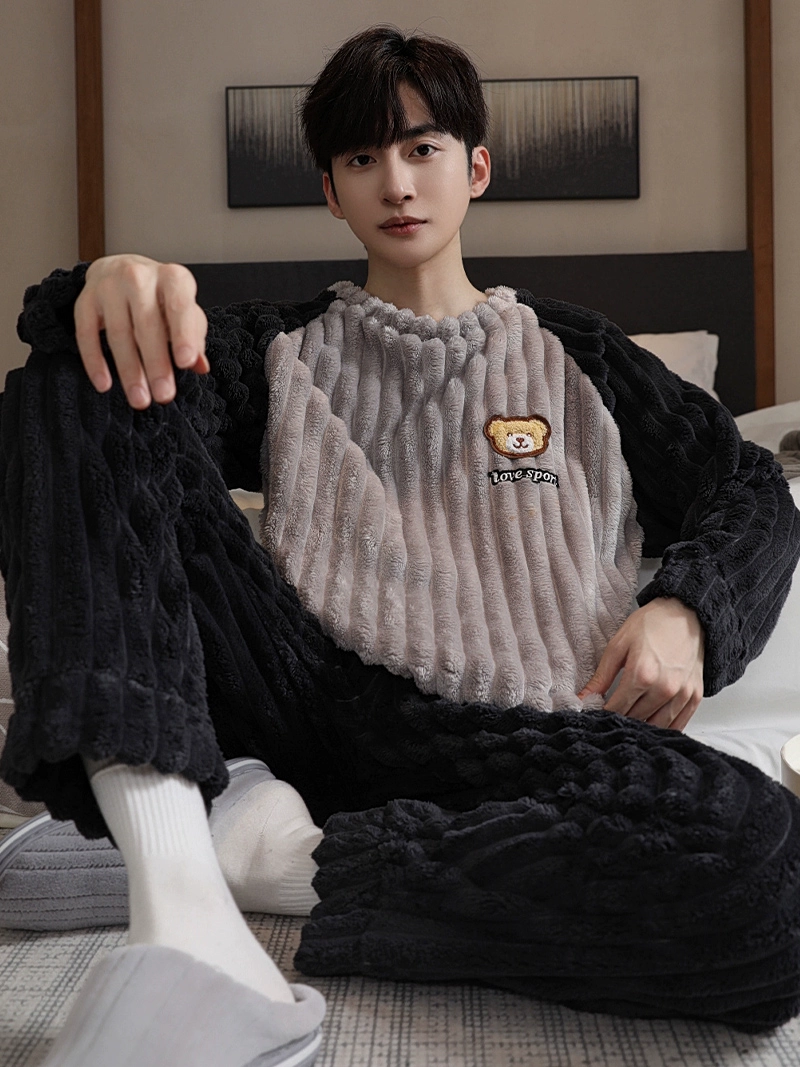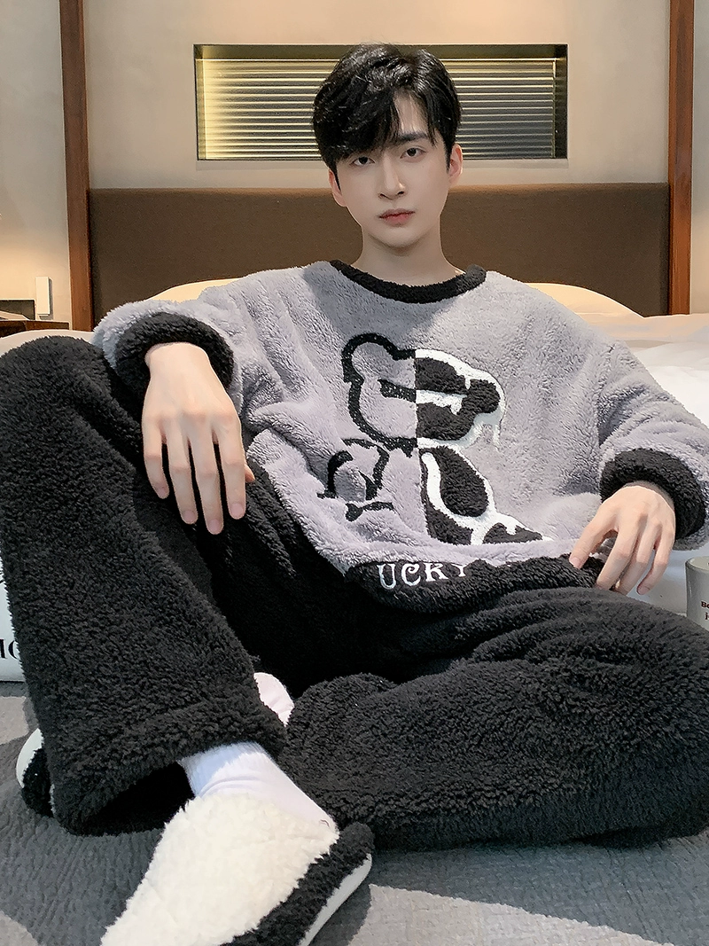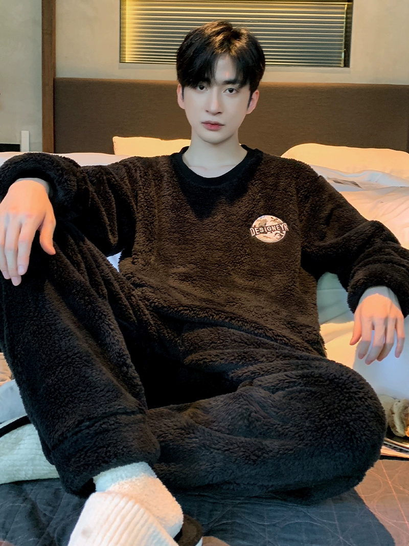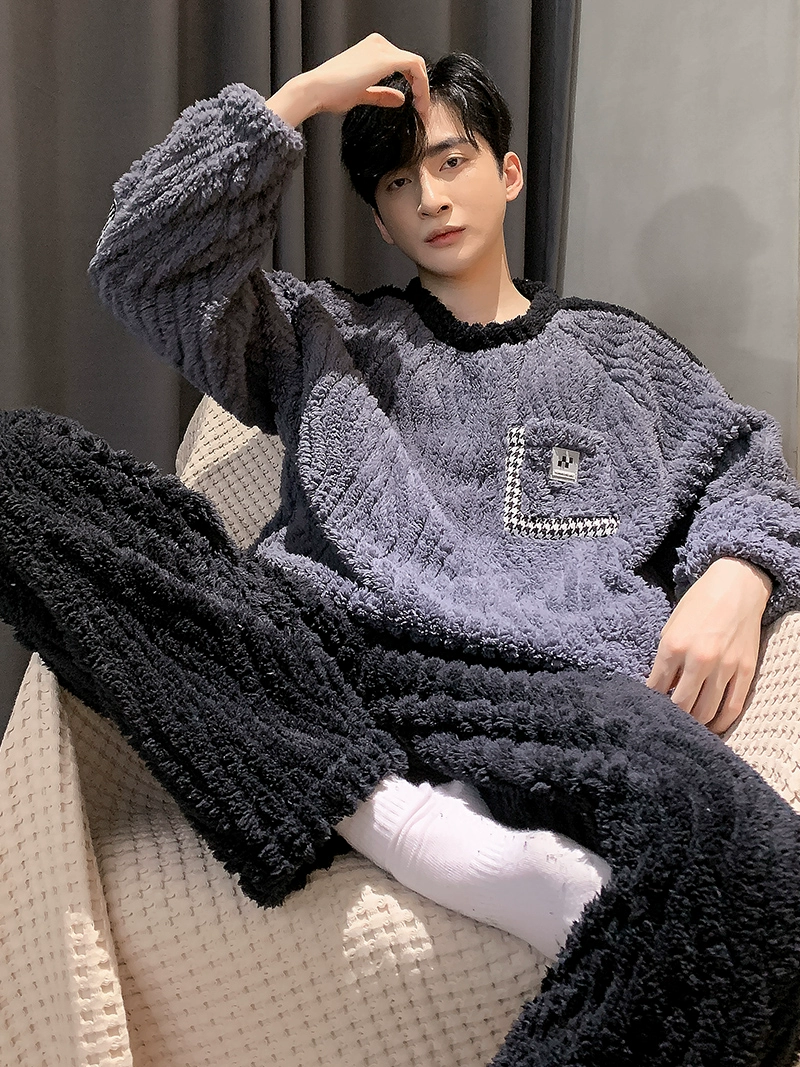 Antarctic Coral Velvet Pajamas Men’s Winter Autumn and Winter Plus Velvet Thickened Warmth Large Size Flannel Home Clothes Set