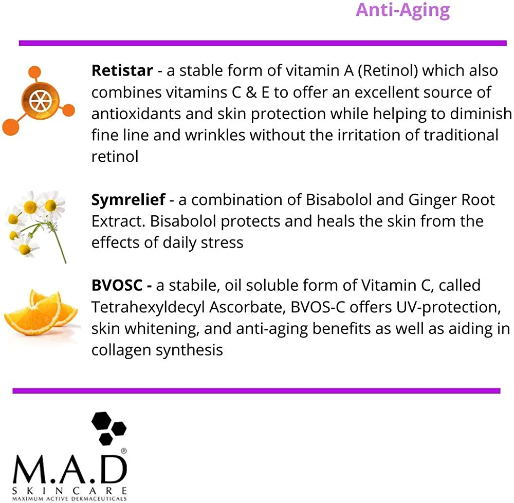 MAD Anti-Aging Products are specially formulated to combat the signs of aging using a combination of advanced peptides, multi-plant stem cell complex, and glycolic acid. Our range of skincare products includes cleansers/toners, moisturizers, eye creams, serums, and wrinkle minimizers that deliver superior anti-aging results.
