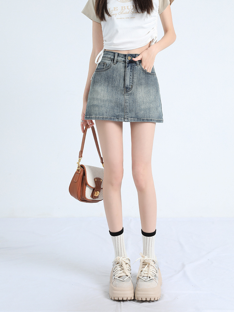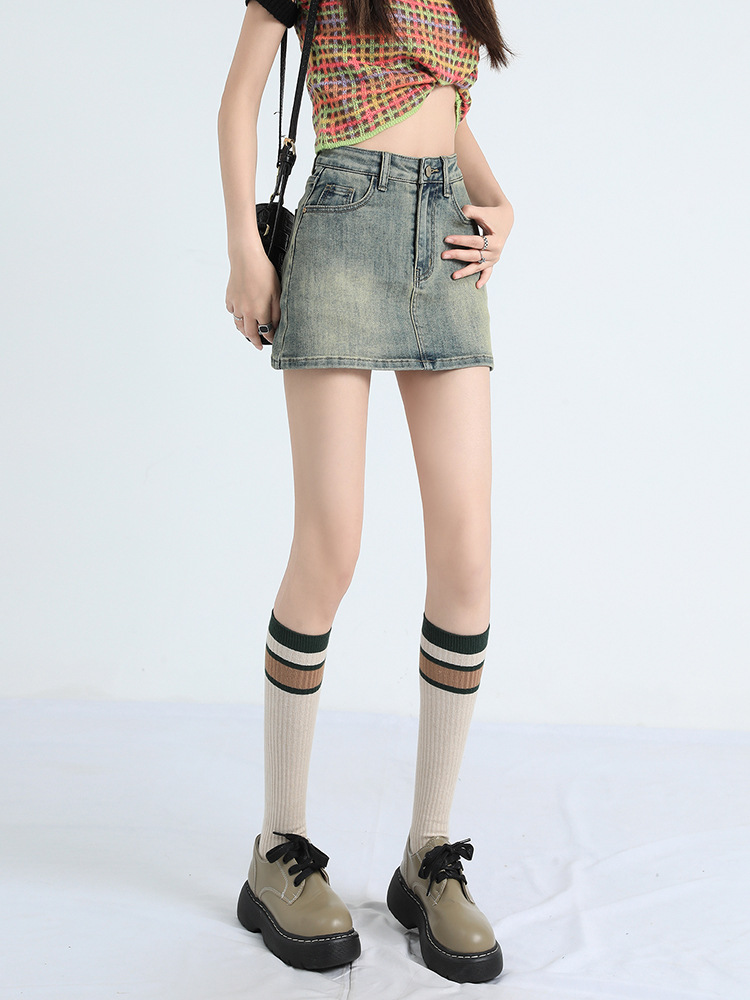 | nameOriginal | Antique Spice Hip Skirt Nostalgic A- line Denim Skirt High Waist Stretch Light-proof Lining Slimming Half-length Skirt |