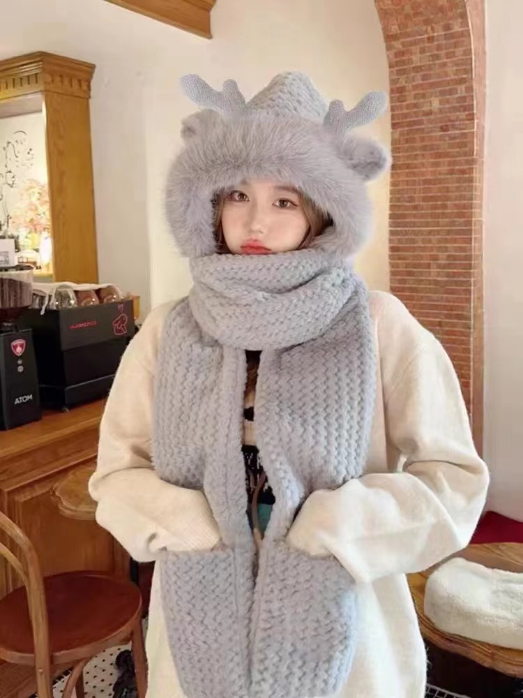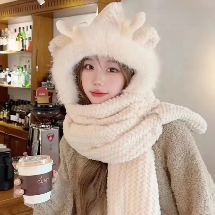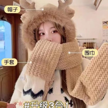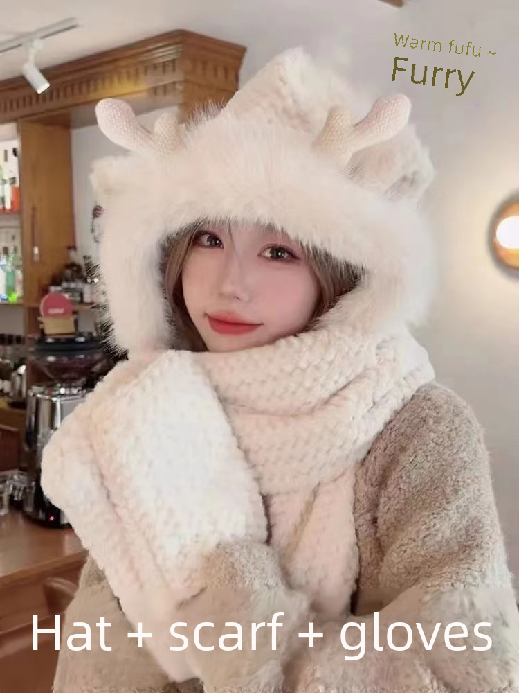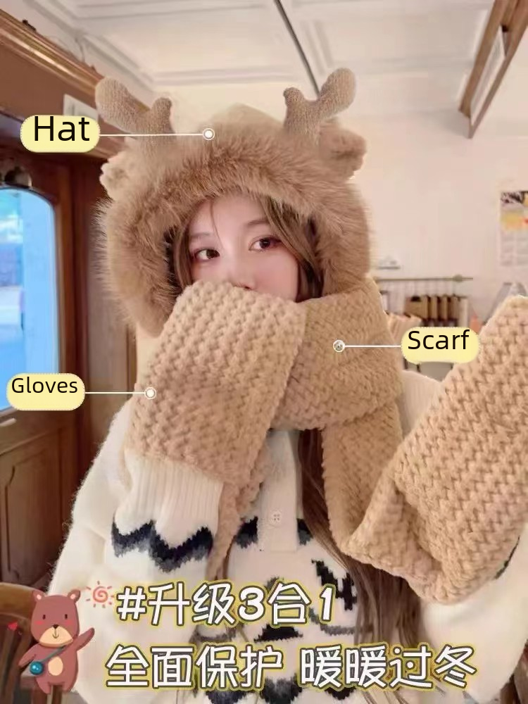 Antler three-piece hat winter gloves scarf integrated cute all-match warm thickened three-in-one plush hat