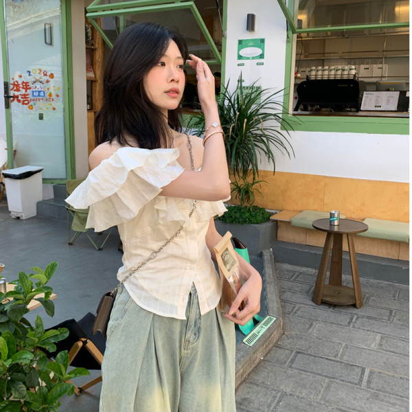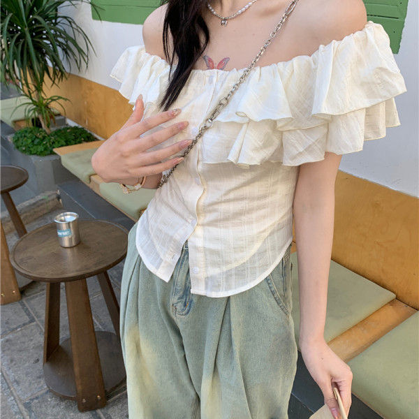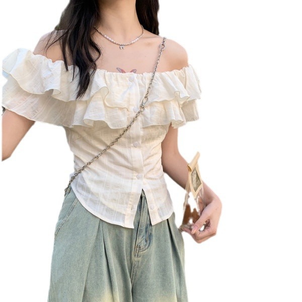 | nameOriginal | apricot French Style One-character Collar Ruffled Short-sleeved Shirt Women's Summer 2024 New Sweet Style Slim-fit Short Top |