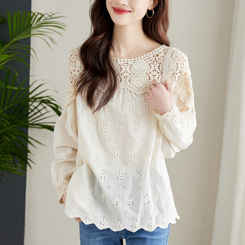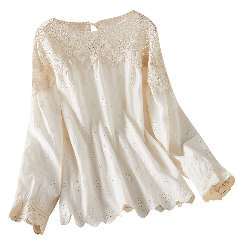 Apricot Lace Hollow Shirt Women's Long-sleeved 2024 Spring New Design Niche Top Chic Cotton Shirt