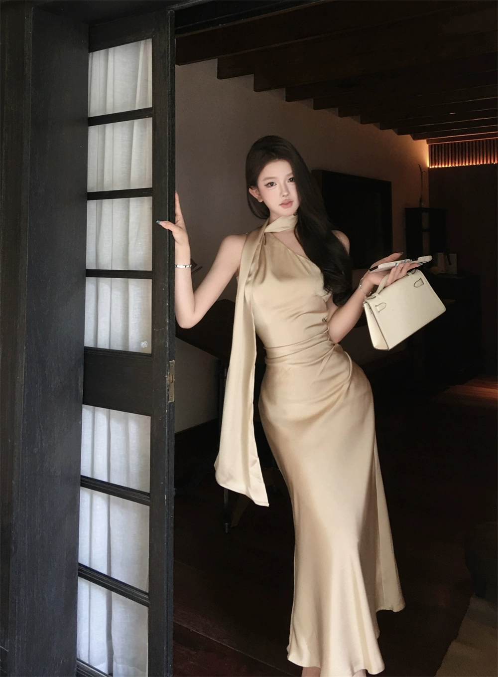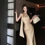 Apricot ribbon slant shoulder dress summer slimming satin