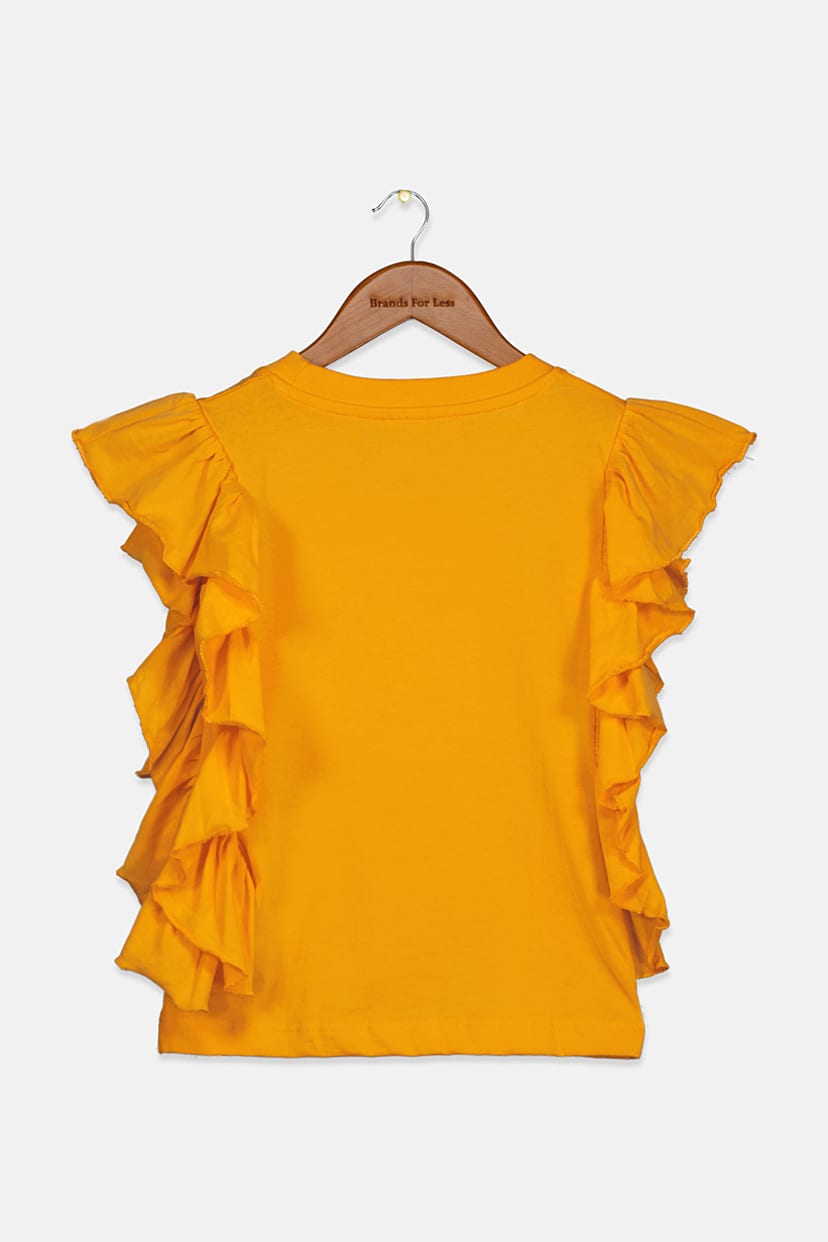 This product is recommended for girls and should be hand washed. It features a sleeveless design with a straight hem and a crew neckline. The sleeves are adorned with ruffles, and the fabric is made of 100% cotton. The graphic print adds a touch of style, and it can be easily put on with a pullover closure. The color family of this product is orange.