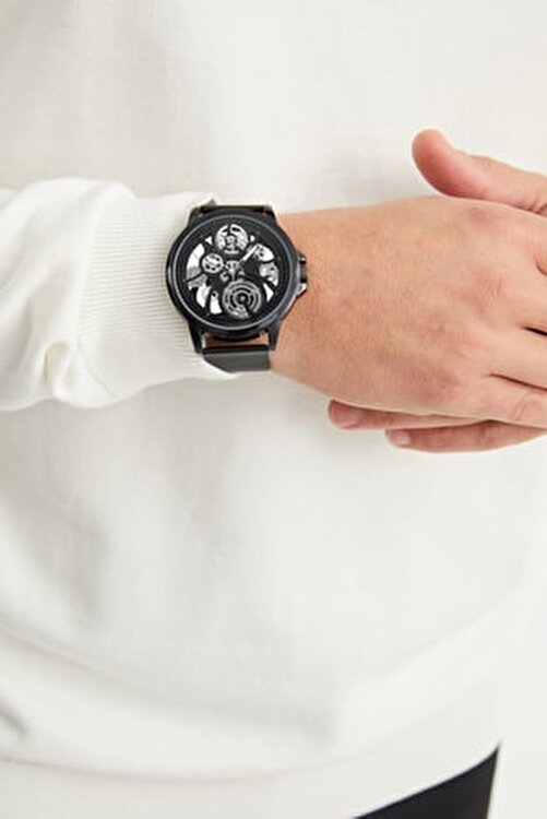 Mechanism/Display Type: Quartz Dial Color: Black Dial Shape: Round Case Color: Black Cord Color: Black Cord Type: Wicker Case Diameter: 44 Alarm: No, Glass: Mineral, Stopwatch: No, Water Resistance: Hand Wash, Calendar: Yes