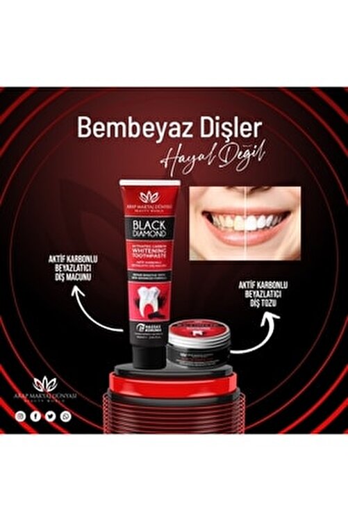 Ingredients/Ingredients: Aqua, Calcium Carbonate, Magnesium Aluminum Silicate, Cocamidopropyl Betaine, Hydroxyethylcellulose, Glycerin, Phenoxyethanol, Sodium Bicarbonate, Aroma, Sodium Saccharin, Charcoal Powder, Menthol, Sodium Fluoride, Ethylhexylglycerin, Melaleuca Alternato Nifolia Leaf Oil, Mentha Piperita Oil, Salvia Officinalis Extract, Carbon Black Active Ingredients/Active Ingredients: Sodium Fluride (500 ppm F) Black Diamond Activated Carbon Whitening Toothpaste is designed for those who want to have whiter teeth and a fresh breath. It allows you to get white teeth with regular use. Usage: Apply toothpaste about the size of chickpea grain. Brush your teeth twice a day. Warnings: Contains Sodium Floride. It is for external use. Not swallowed. Keep out of the reach of children. Avoid eye contact. In case of contact, wash with plenty of water. Store at room temperature, with the mouth tightly closed from heat and light. It is for adults. Teeth Whitening Powder • Activated Carbon Teeth Cleaning Powder helps your teeth have a shiny appearance. • The amount of fluorine in food, beverages and drinking water can cause color differences in our teeth. • Activated Carbon Teeth Cleaning Powder is a product that helps to perform dental care by coping with problems such as yellowing or bad breath of teeth. and used, Activated Carbon Dental Cleaning Powder helps you get whiter teeth in a short time.