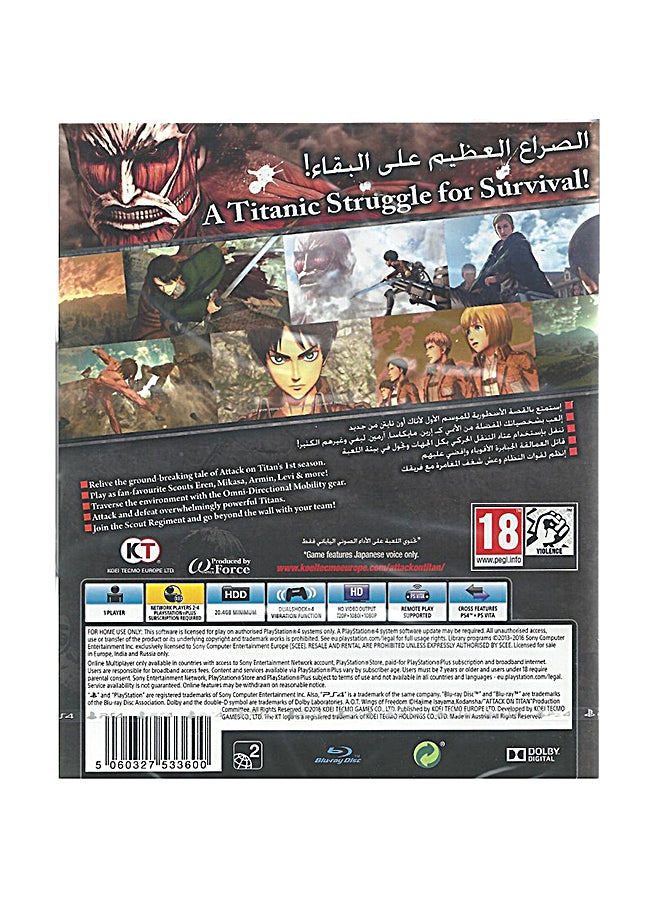 The Attack on Titan Wings of Freedom (Arabic) for PlayStation 4 is an action-packed and thrilling game that will keep you on the edge of your seat. Based on the popular anime series, this game allows you to experience the epic battles between the Titans and the Survey Corps. With stunning graphics and immersive gameplay, you will feel like you are a part of the action. As a player, you will take on the role of Eren, Mikasa, and other characters as you fight to protect humanity from the Titans. The game features a variety of weapons and equipment that you can use to take down the Titans, including the iconic Omni-Directional Mobility Gear. With its fast-paced gameplay and intense battles, Attack on Titan Wings of Freedom (Arabic) is a must-have for any fan of the series or anyone who loves action and shooter games on PlayStation 4 (PS4).