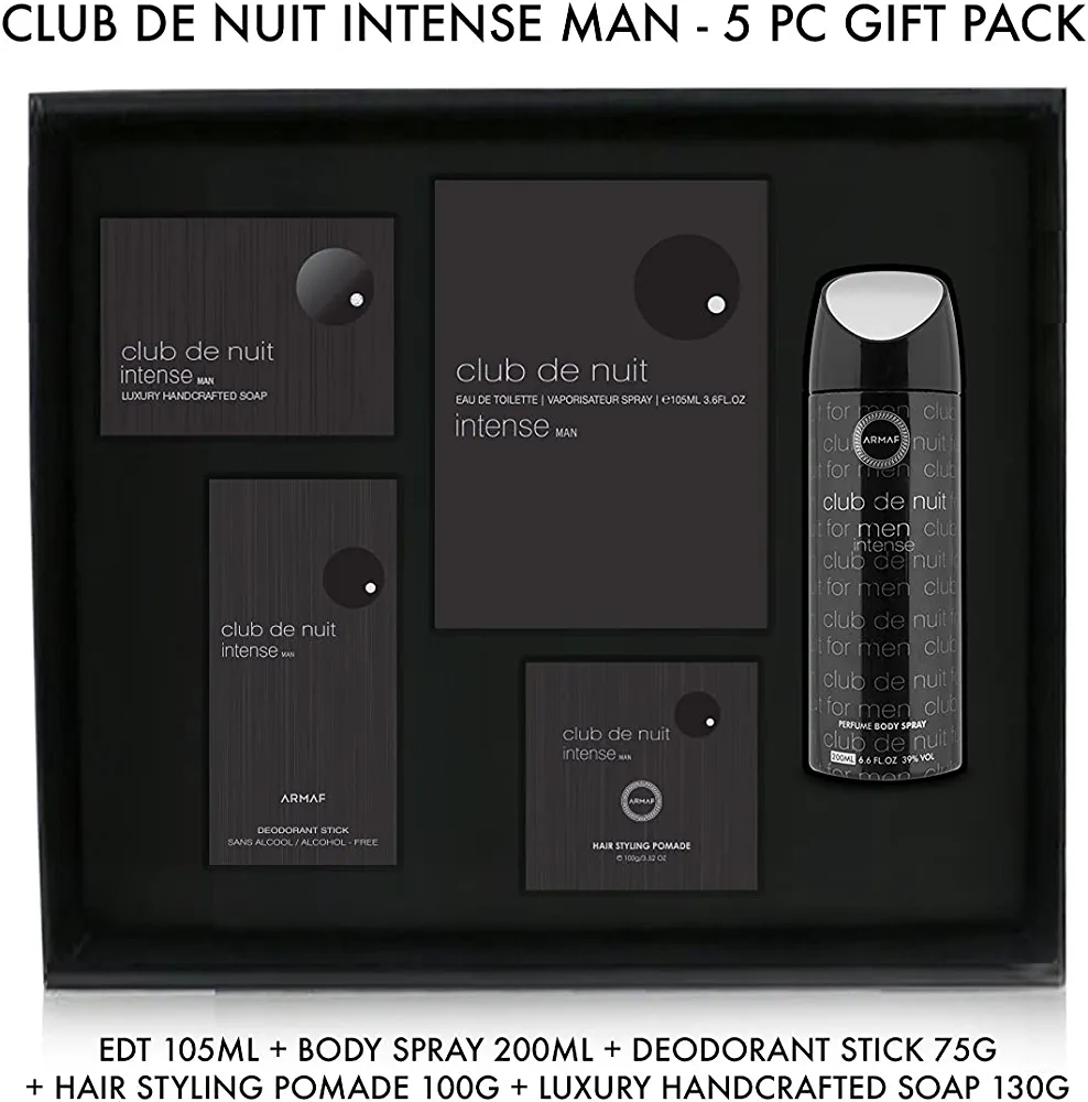 The Armaf Perfumes Club De Nuit Intense Man 5 Pieces Gift Set is the perfect gift for the modern man who appreciates a bold and captivating fragrance. This set includes a 105ml Eau De Toilette, a 200ml Body Spray, a 75g Deodorant Stick, a 100g Hair Pomade, and a 130g Luxury Soap, all infused with the Club De Nuit Intense Man fragrance.