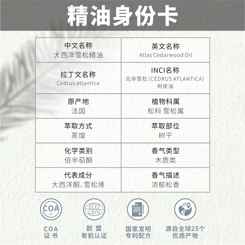 | nameOriginal | Aromatherapy grade France imported Atlantic cedar essential oil natural plant unilateral aromatherapy essential oil raw materials wholesale |