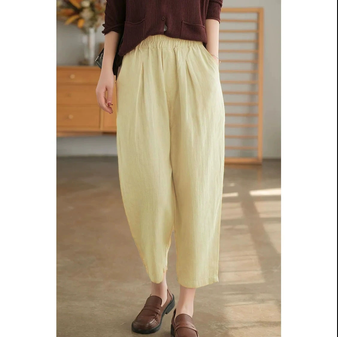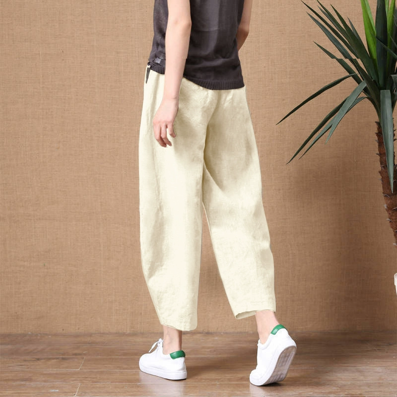 Artistic cotton and linen nine-point thin elastic waist retro pants