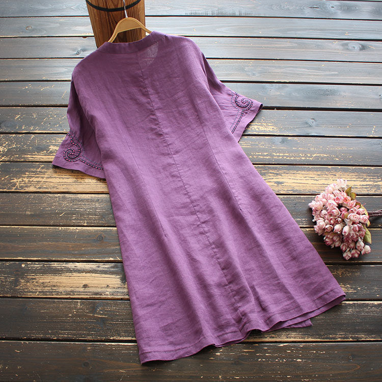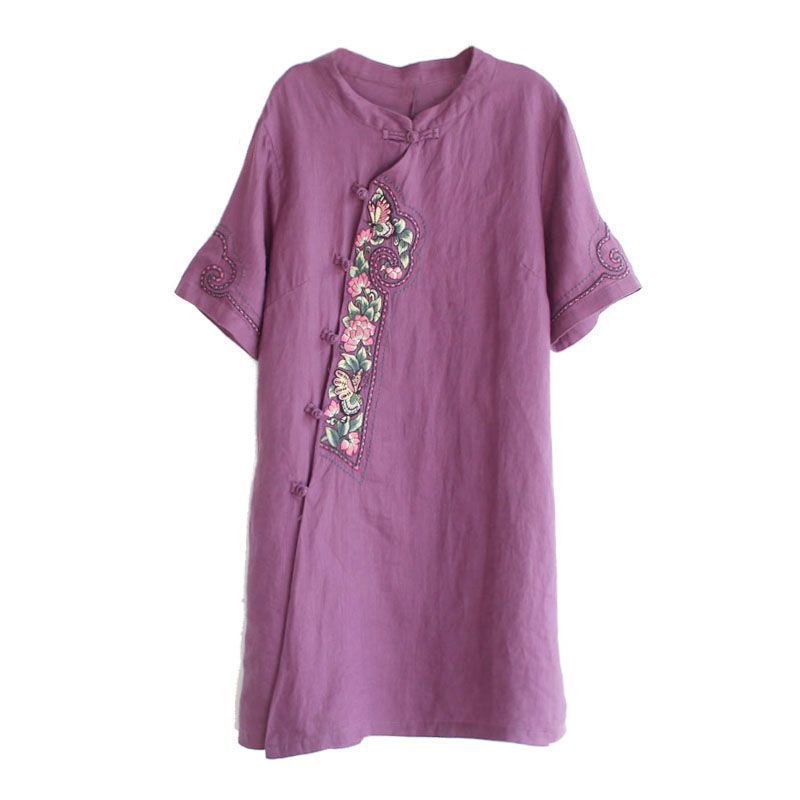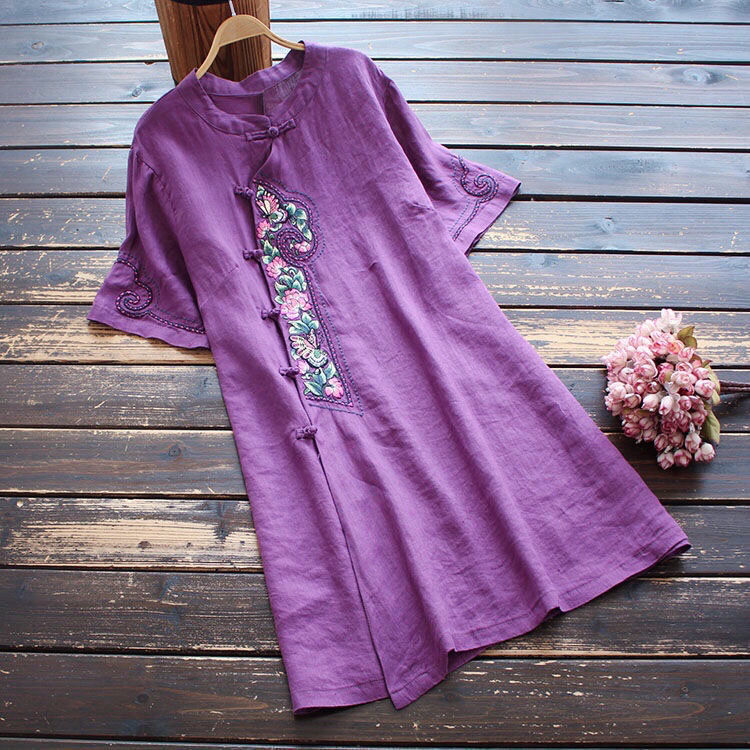 Artistic Retro Dress Short-sleeved 2024 Summer Loose Vertical Collar Solid Color Embroidered Cotton and Linen Women's Top