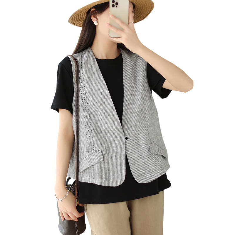 Artistic retro Embroidered striped linen vest women’s summer outer wear loose stacked vest cotton and linen top thin