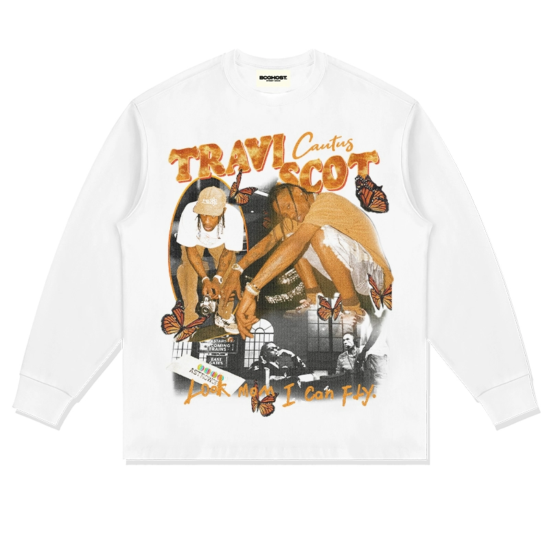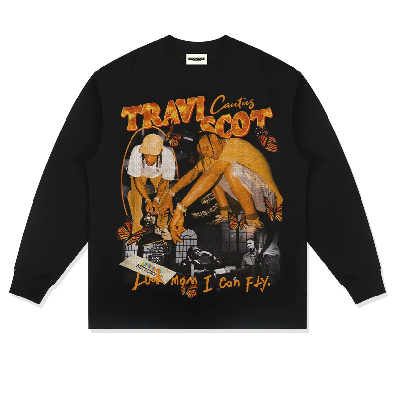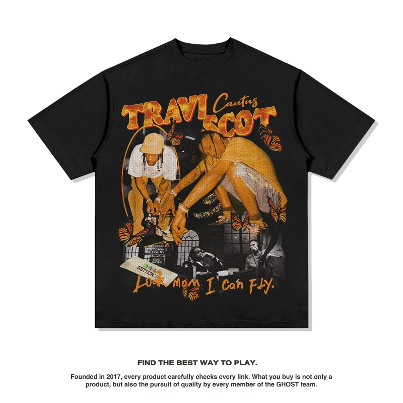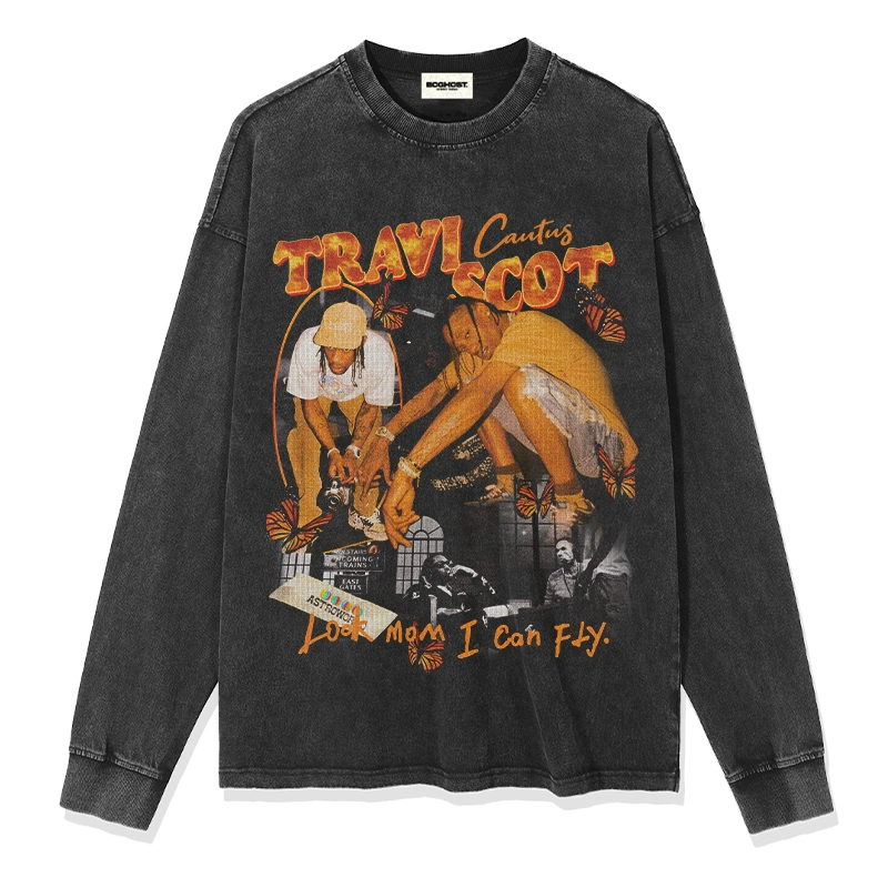 ASAP hip-hop rap Travis Scott printed long-sleeved short-sleeved washed distressed TS loose small neckline T-shirt