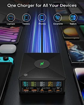 The ASOMETECH USB Charging Station is the ultimate solution for all your charging needs. With a powerful 160W output, this 5-port charging station can charge multiple devices simultaneously, including your MacBook, laptop, iPad, iPhone, and Samsung devices. The station features a 65W PD USB-C port, a QC3.0 port, and a wireless charger, ensuring that all your devices are charged quickly and efficiently. The LCD display provides real-time information on the charging status of each device, making it easy to keep track of your charging progress. The compact and sleek design of the charging station makes it perfect for use at home, in the office, or on the go. Say goodbye to messy cables and slow charging times with the ASOMETECH USB Charging Station.