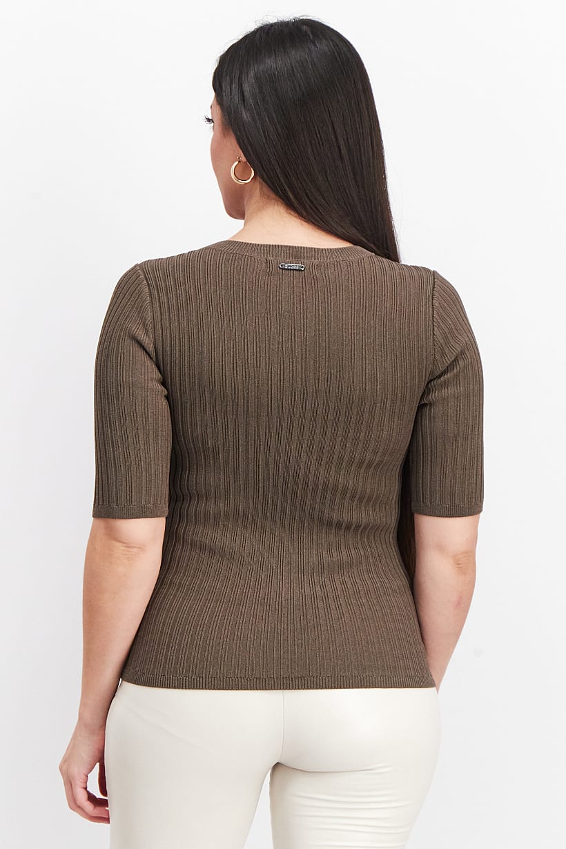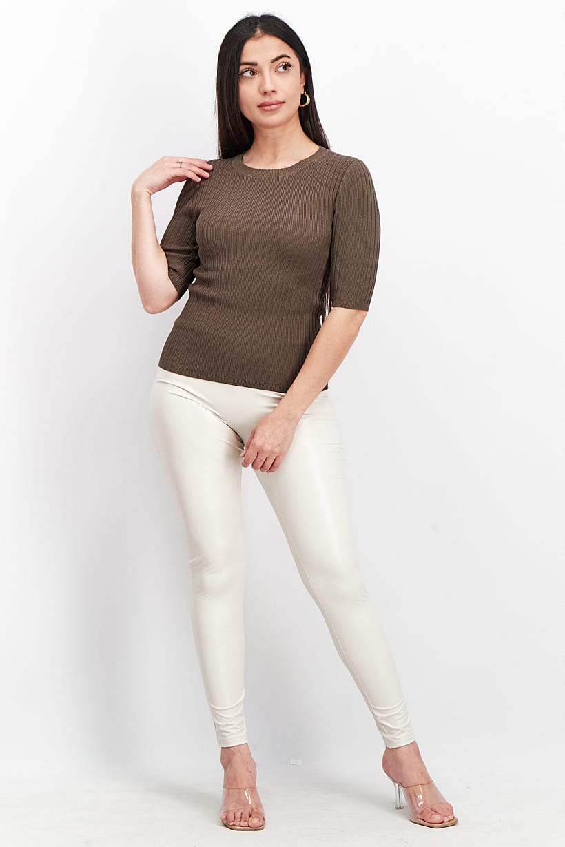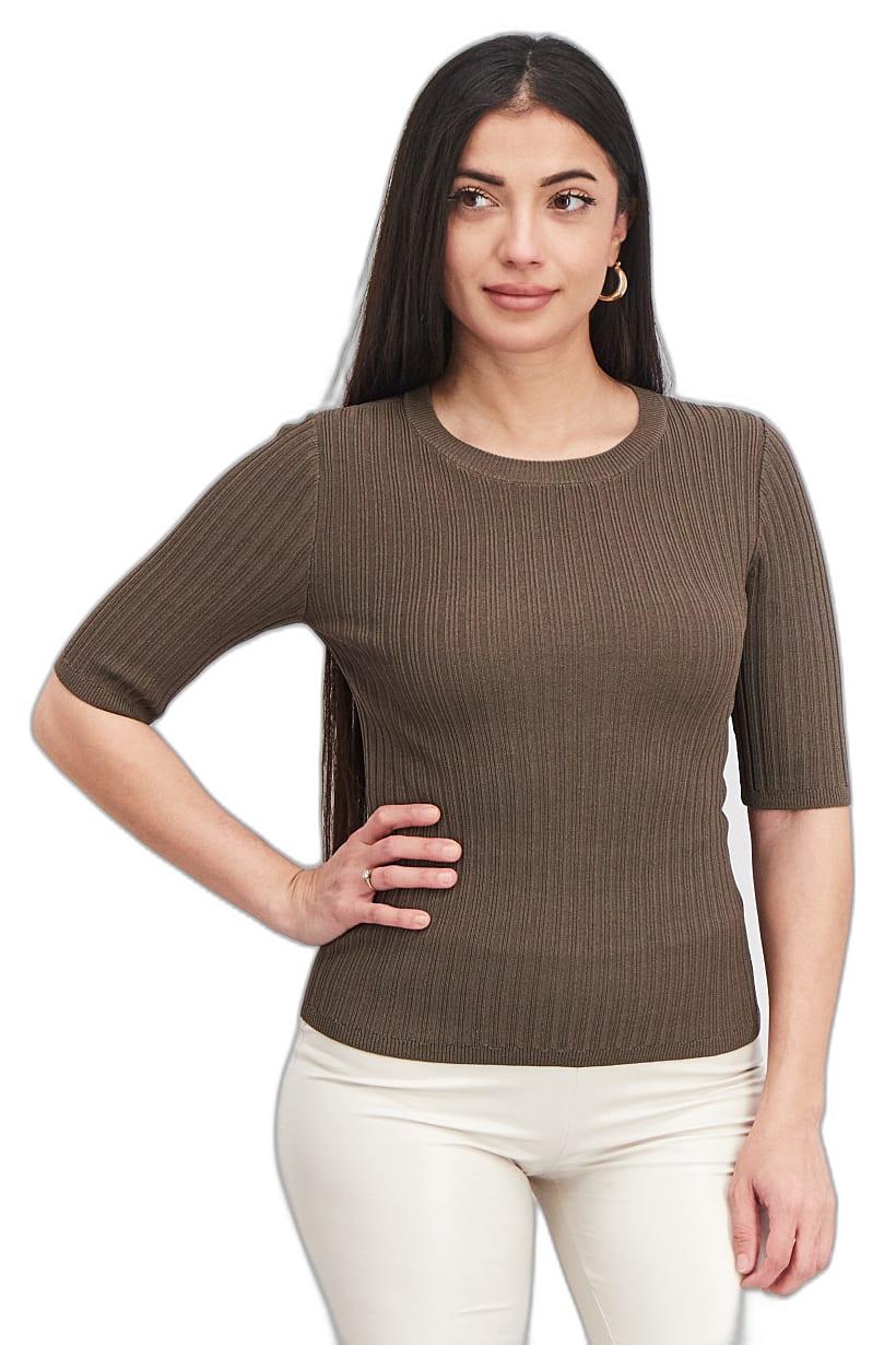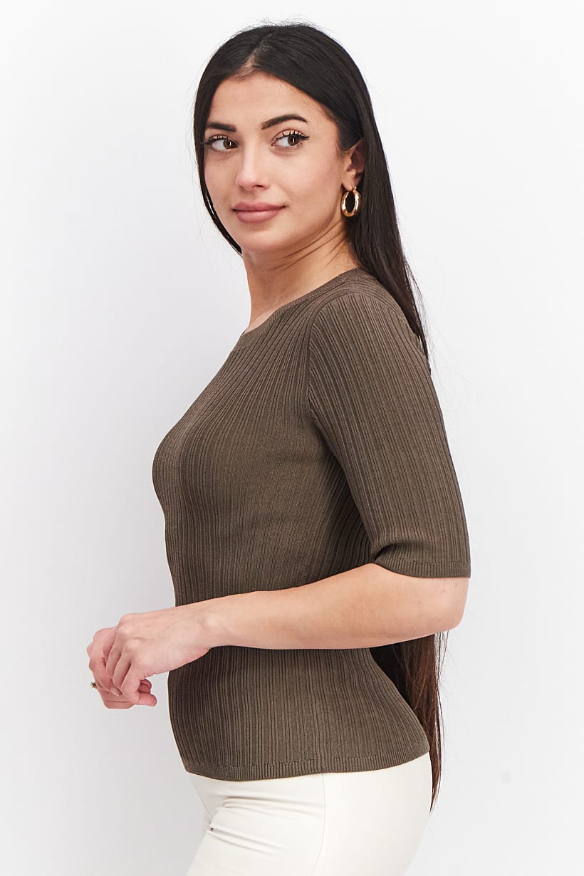 Asphalt Grey Ribbed Crew Neck Top for Women with Short Sleeves.