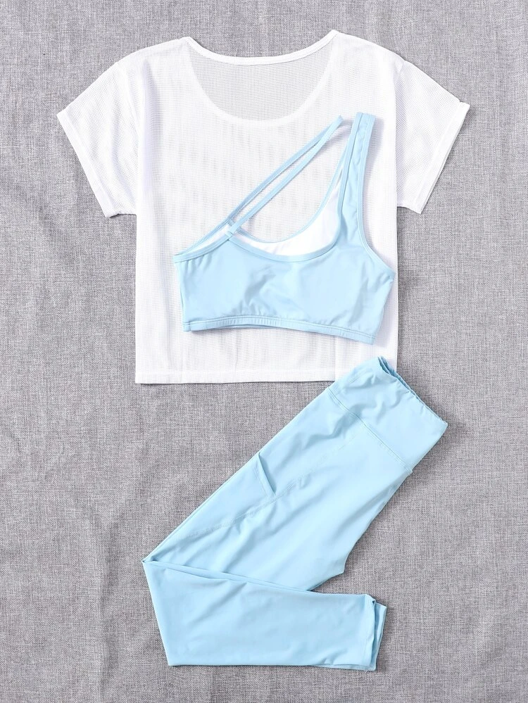 Introducing our 3pcs Workout Athletic Set, the perfect combination of style and functionality for your active lifestyle. This set includes an asymmetrical neck sports bra, a fishnet tee, and leggings with a convenient phone pocket.