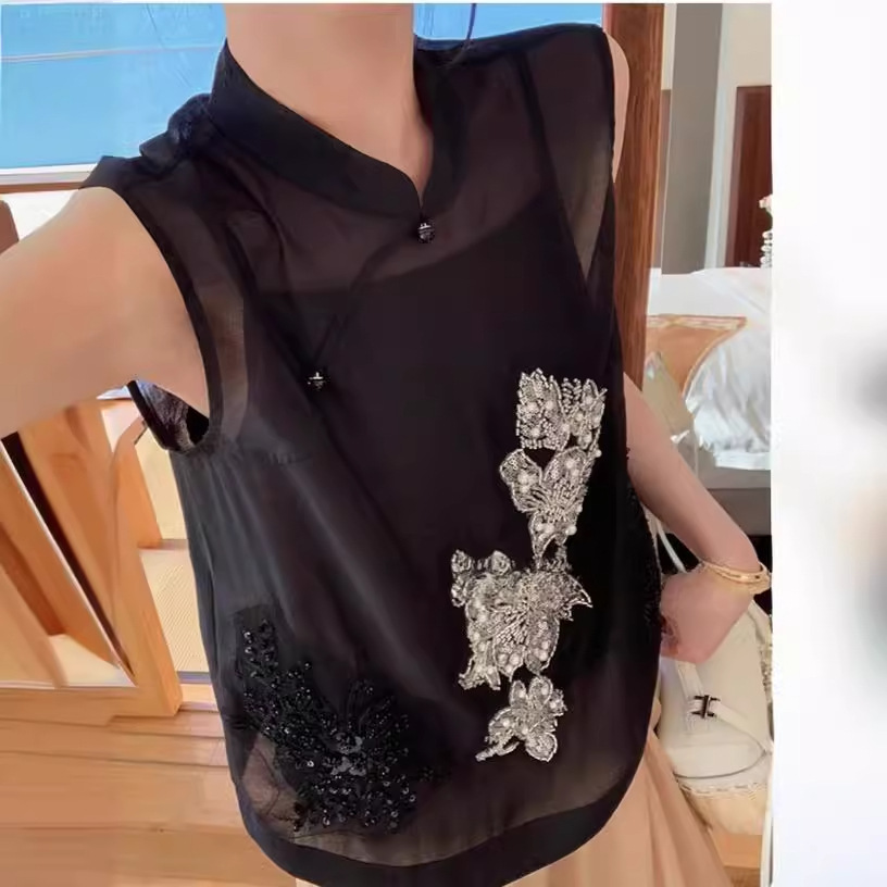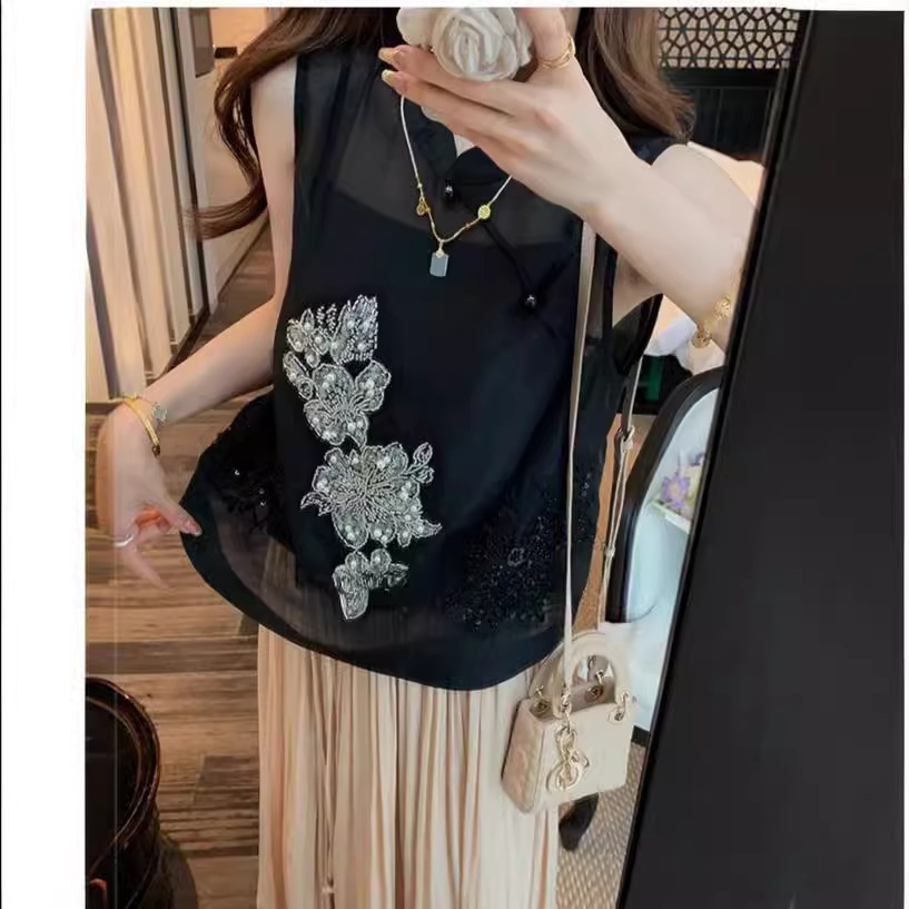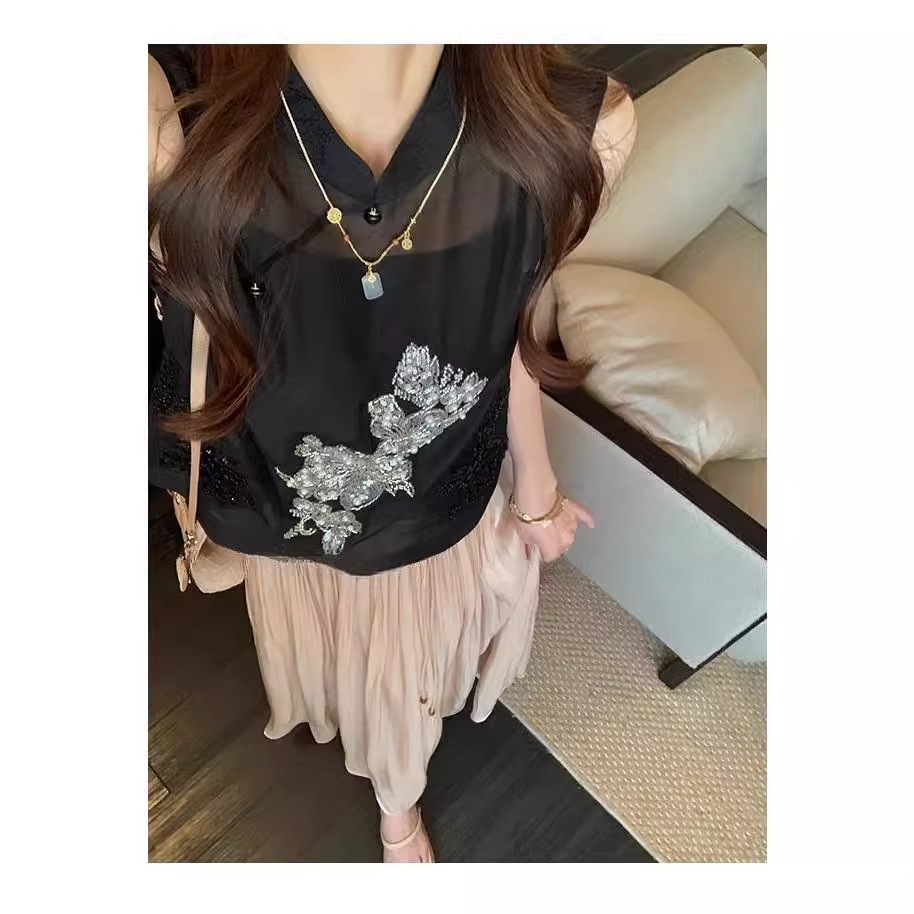 At first glance, stunning ~ light national style sleeveless Chinese shirt black heavy-duty sequined top