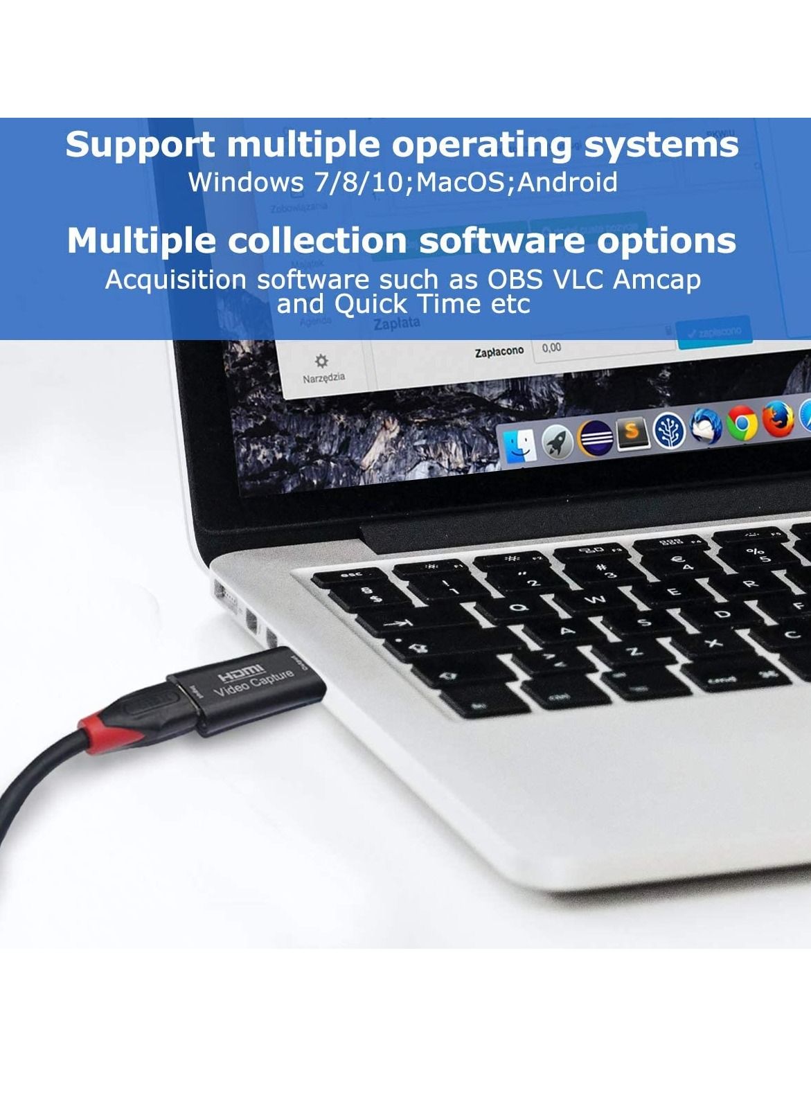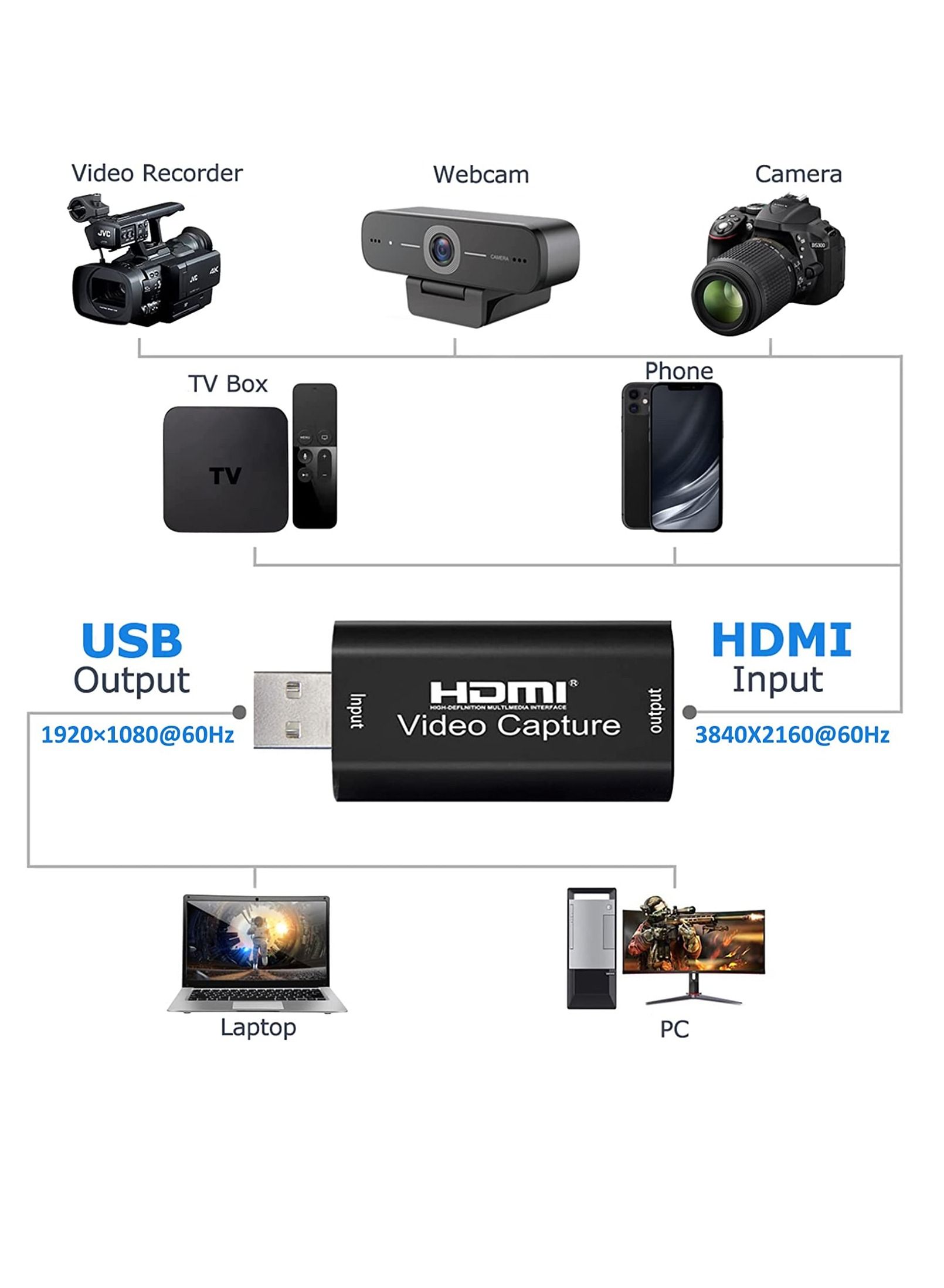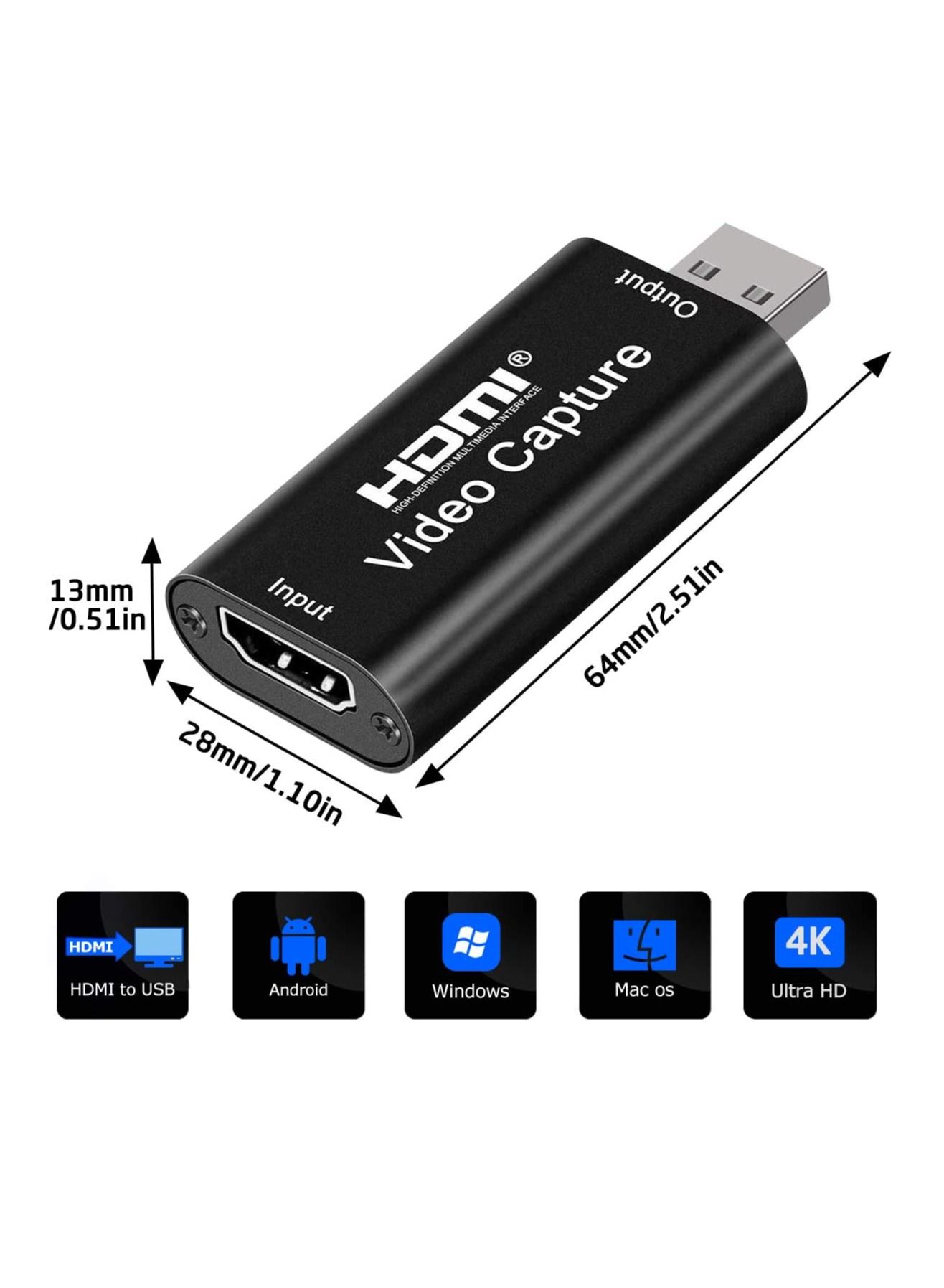 | nameOriginal | Audio Video Capture Cards HDMI to USB 1080P USB 2.0 Record via DSLR Camcorder Action Cam for Gaming Live Broadcasting Streaming Black |